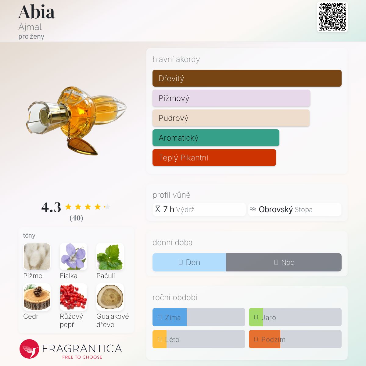 Abia podle Ajmal je Woody Floral Musk vůně pro ženy. Abia byl/a uveden/a v roce 2014. Vrchní tóny jsou Růžový pepř, Bergamot a Citrón; střední tóny jsouFialka, Kardamom a Pelyněk ; základní tóny jsou Pižmo, Pačuli, Cedr, Guajakové dřevo a Vetiver.