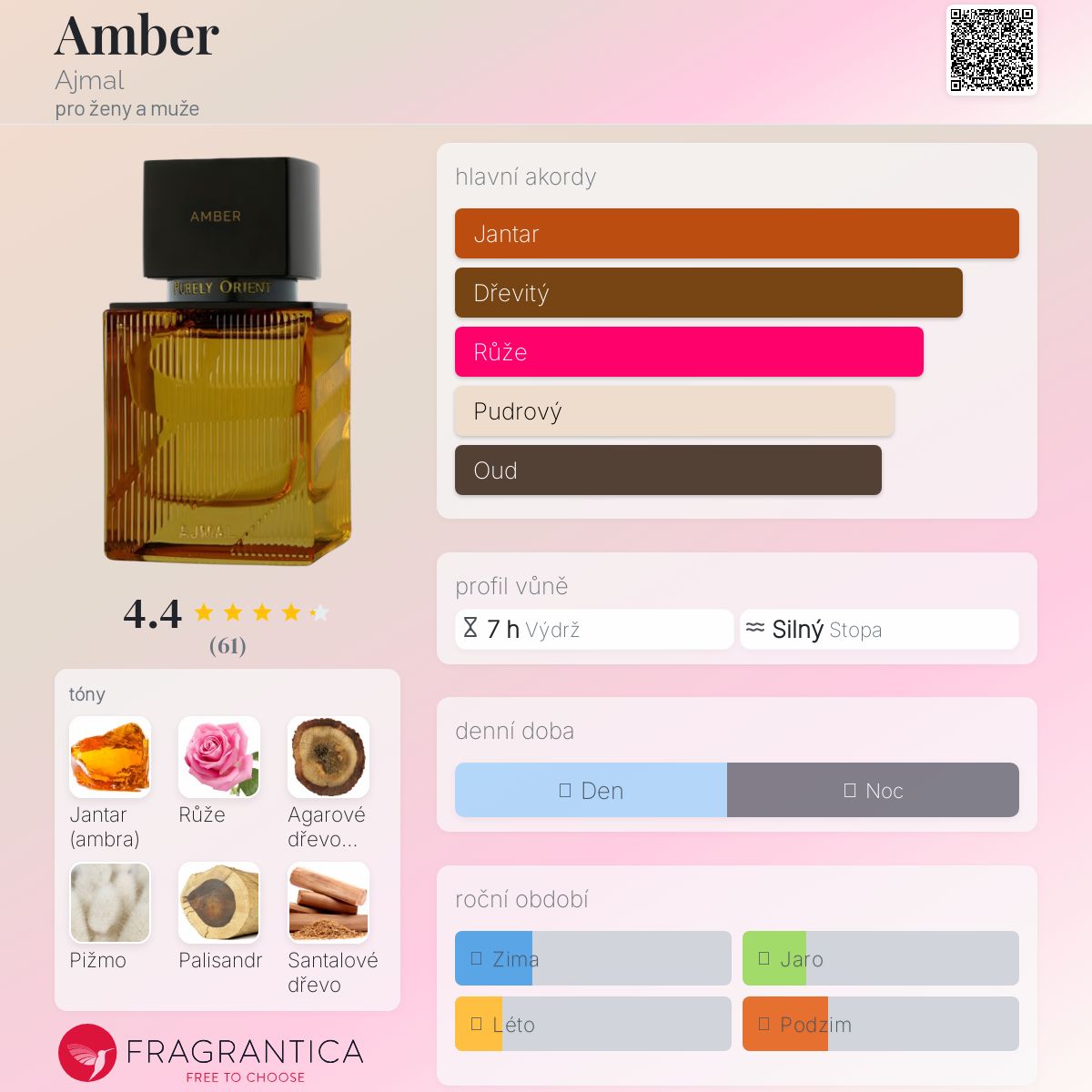 Amber podle Ajmal je Orientální Woody vůně pro ženy a muže. Amber byl/a uveden/a v roce 2019. Vrchní tóny jsou Bergamot a Pepř; střední tóny jsouRůže, Palisandr a Jasmín ; základní tóny jsou Jantar (ambra), Agarové dřevo (oud), Pižmo a Santalové dřevo.