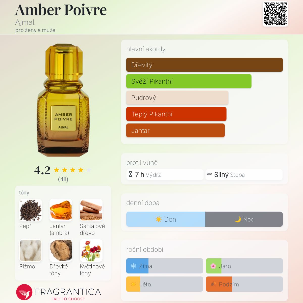 Amber Poivre podle Ajmal je Orientální Spicy vůně pro ženy a muže. Amber Poivre byl/a uveden/a v roce 2019. Vrchní tóny jsou Pepř, Muškátový oříšek a Cypřiš; střední tóny jsouDřevité tóny a Květinové tóny ; základní tóny jsou Jantar (ambra), Santalové dřevo, Pižmo, Pačuli a Cedr.