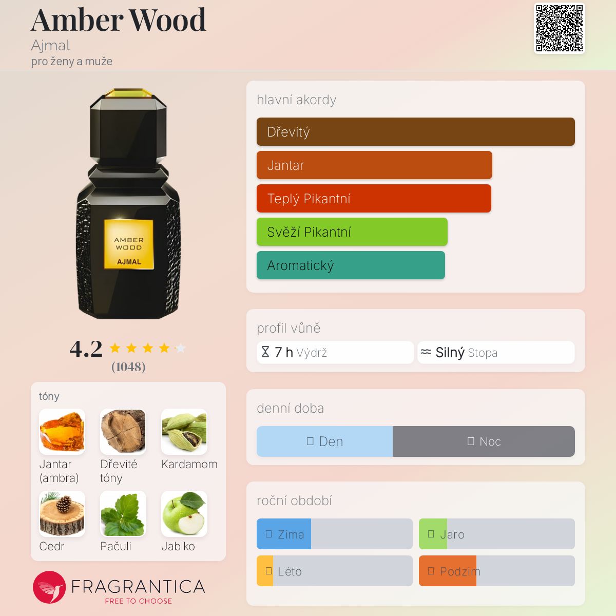 Amber Wood podle Ajmal je Orientální Woody vůně pro ženy a muže. Amber Wood byl/a uveden/a v roce 2014. Vrchní tóny jsou Kardamom, Jablko, Levandule a Bílý pepř; střední tóny jsouCedr a Orris ; základní tóny jsou Jantar (ambra), Dřevité tóny a Pačuli.