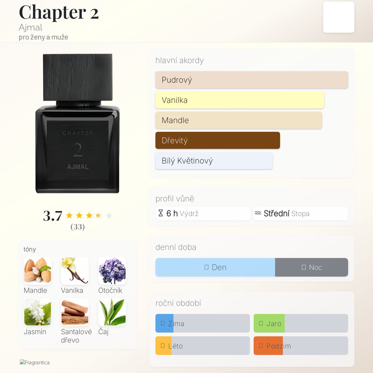 Chapter 2 podle Ajmal je Floral Woody Musk vůně pro ženy a muže. Toto je nová vůně. Chapter 2 byl/a uveden/a v roce 2025. "Nosem" za touto vůní je Dalia Izem. Vrchní tóny jsou Jasmín, Černý čaj a Koření; střední tóny jsouMandle, Otočník a Orris ; základní tóny jsou Vanilka, Santalové dřevo a Pižmo.