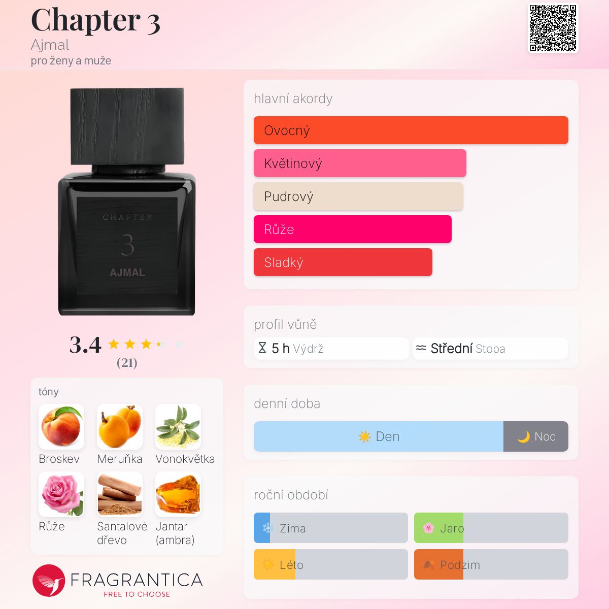 Chapter 3 podle Ajmal je Floral Fruity vůně pro ženy a muže. Toto je nová vůně. Chapter 3 byl/a uveden/a v roce 2025. "Nosem" za touto vůní je Benjamin Belizon. Vrchní tóny jsou Broskev, Meruňka, Červené ovoce a Zelené tóny; střední tóny jsouVonokvětka a Růže ; základní tóny jsou Santalové dřevo, Jantar (ambra) a Pižmo.