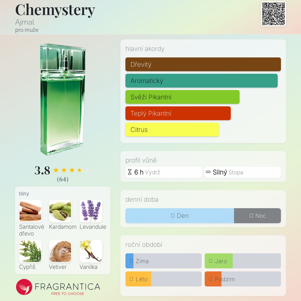 Chemystery podle Ajmal je Aromatic Fougere vůně pro muže. Chemystery byla spuštěna během 2000. "Nosem" za touto vůní je Nazir Ajmal. Vrchní tóny jsou Kardamom, Grapefruit, Muškátový oříšek, Mandarinka a Bazalka; střední tóny jsouLevandule, Cypřiš a Tymián ; základní tóny jsou Santalové dřevo, Vetiver, Vanilka, Virginský cedr a Fazole tonka.