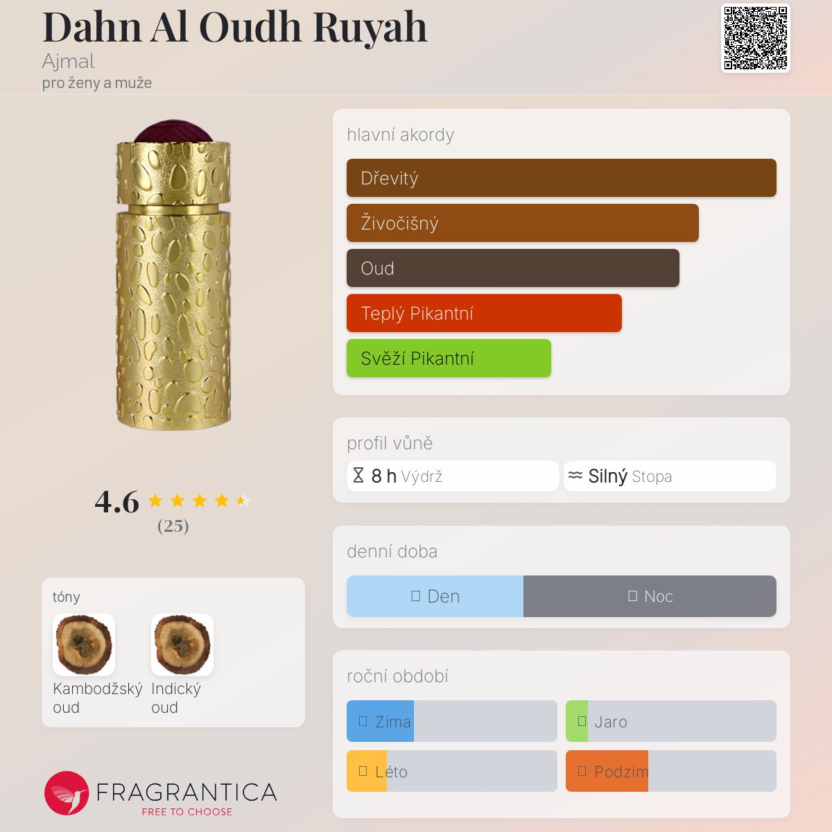Dahn Al Oudh Ruyah podle Ajmal je Orientální Woody vůně pro ženy a muže. Dahn Al Oudh Ruyah byl/a uveden/a v roce 2017.