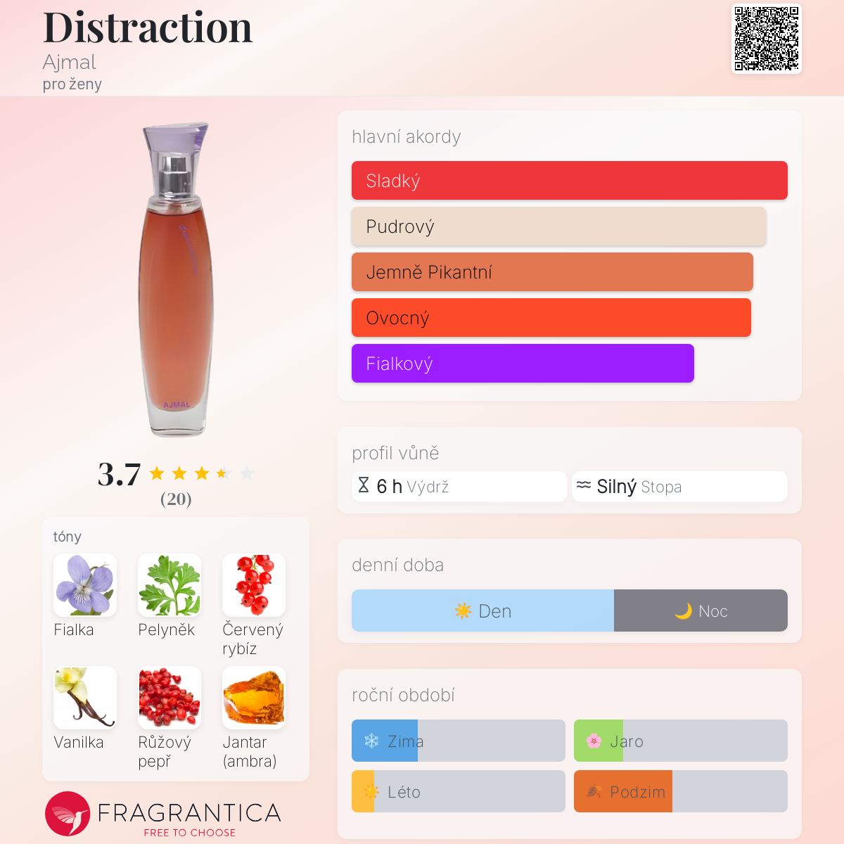 Distraction podle Ajmal je Floral Fruity vůně pro ženy. Distraction byl/a uveden/a v roce 2008. Vrchní tóny jsou Pelyněk, Červený rybíz a Ananas; střední tóny jsouFialka, Vanilka a Růžový pepř ; základní tóny jsou Jantar (ambra), Hořká čokoláda a Pižmo.