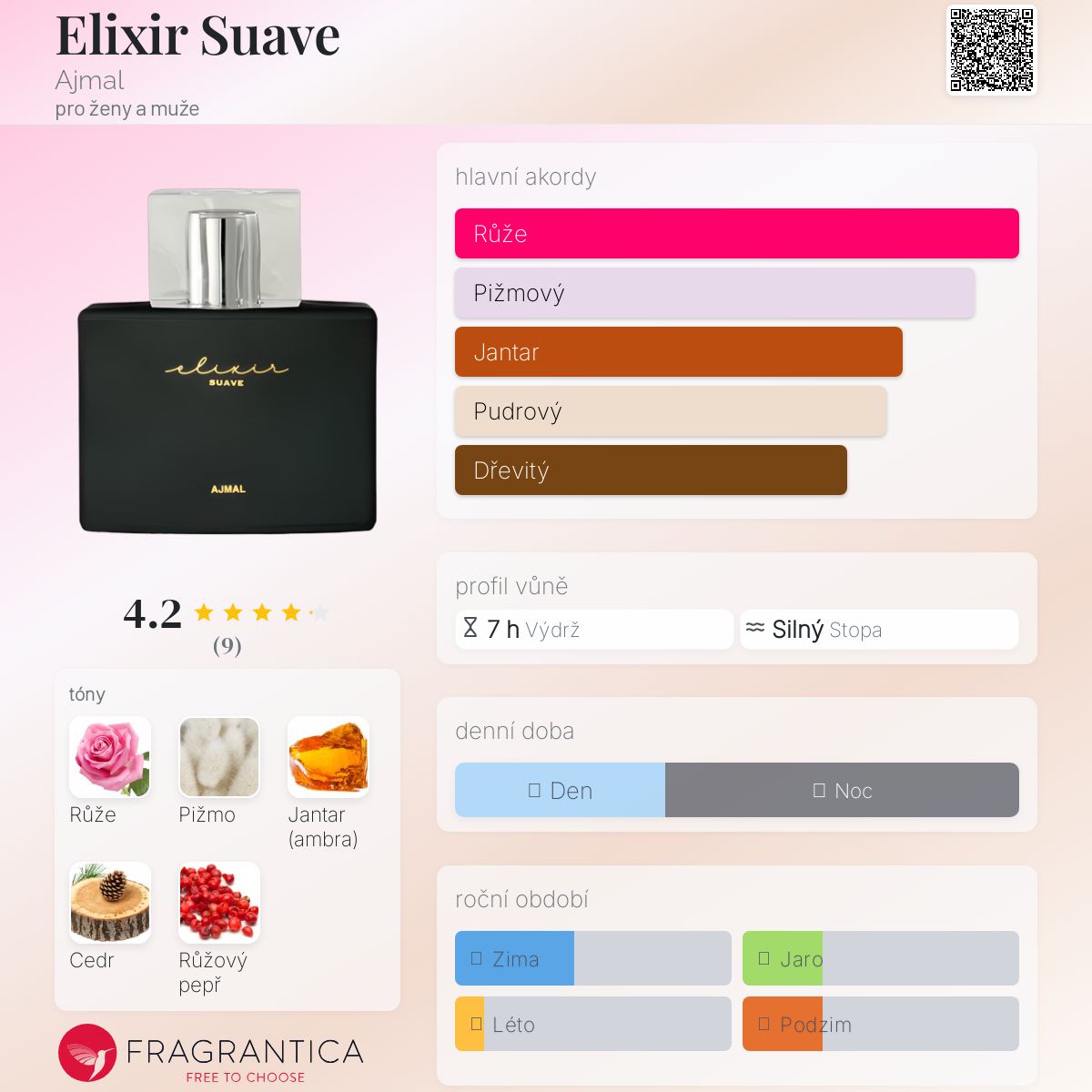 Elixir Suave podle Ajmal je Orientální Floral vůně pro ženy a muže. Elixir Suave byl/a uveden/a v roce 2021. Vrchní tóny jsou Růže a Růžový pepř; střední tóny jsouRůže a Cedr ; základní tóny jsou Pižmo a Jantar (ambra).
