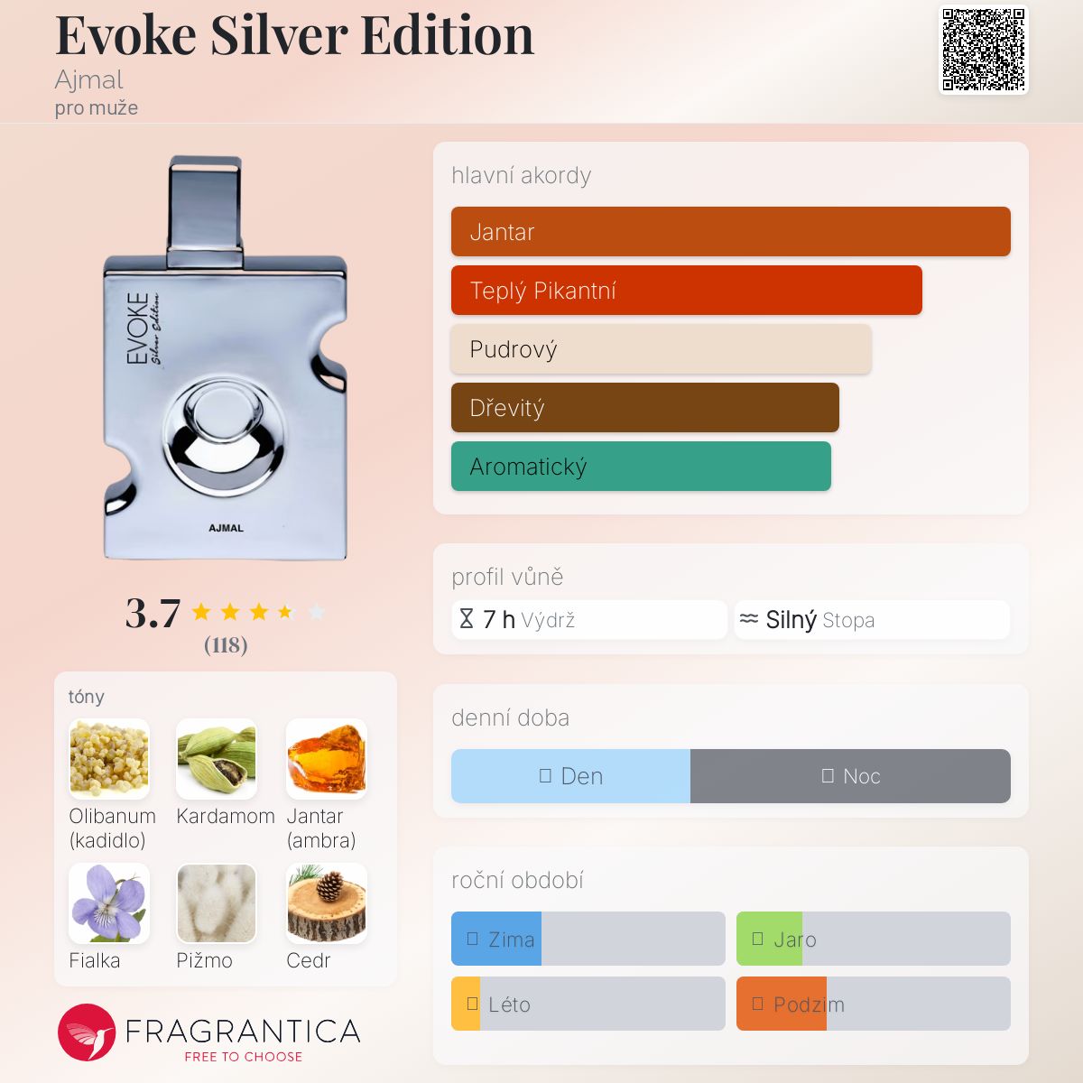 Evoke Silver Edition podle Ajmal je vůně pro muže. Evoke Silver Edition byl/a uveden/a v roce 2016. Vrchní tóny jsou Kardamom a Bergamot; střední tóny jsouOlibanum, Fialka a Pomerančový květ ; základní tóny jsou Jantar (ambra), Pižmo a Cedr.