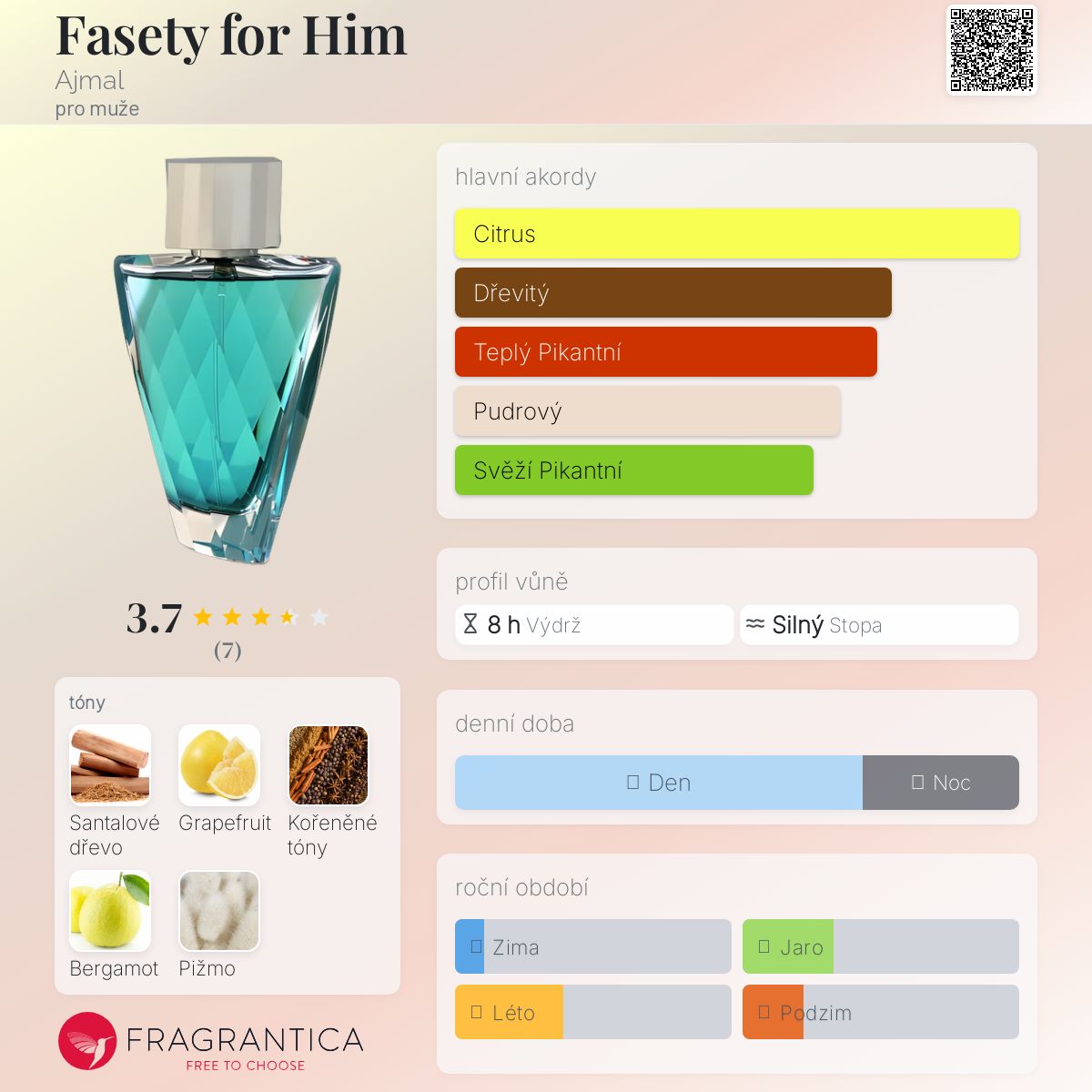 Fasety for Him podle Ajmal je Woody Spicy vůně pro muže. Fasety for Him byl/a uveden/a v roce 2019. Vrchní tóny jsou Grapefruit a Bergamot; střední tón jeKořeněné tóny ; základní tóny jsou Santalové dřevo a Pižmo.