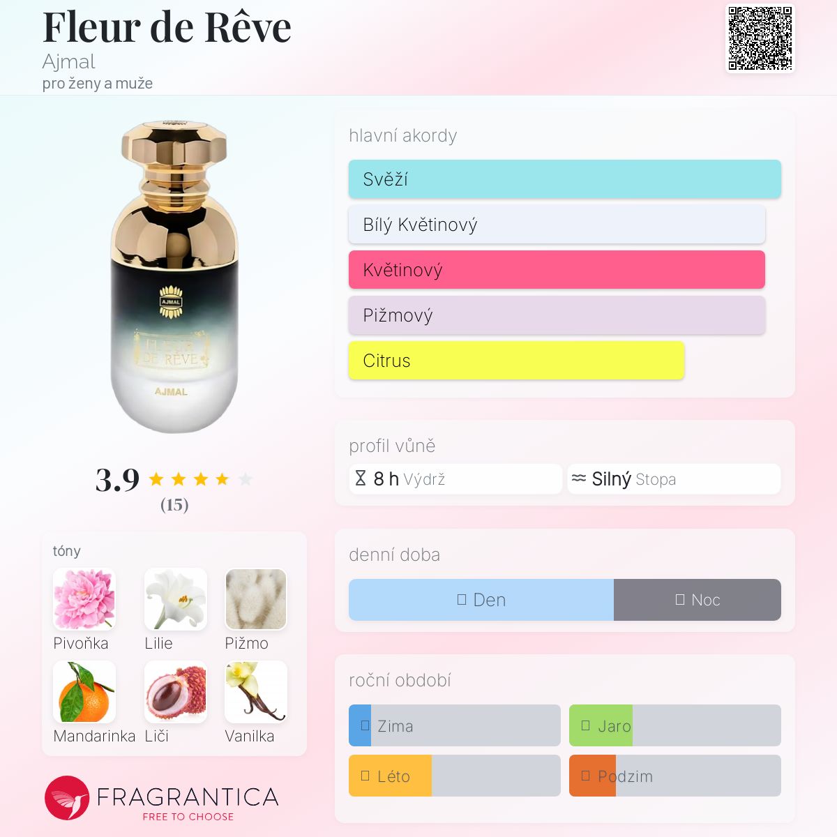 Fleur de Rêve podle Ajmal je Floral Fruity vůně pro ženy a muže. Fleur de Rêve byl/a uveden/a v roce 2014. Vrchní tóny jsou Mandarinka a Liči; střední tóny jsouPivoňka a Lilie ; základní tóny jsou Pižmo, Vanilka a Dubový mech.