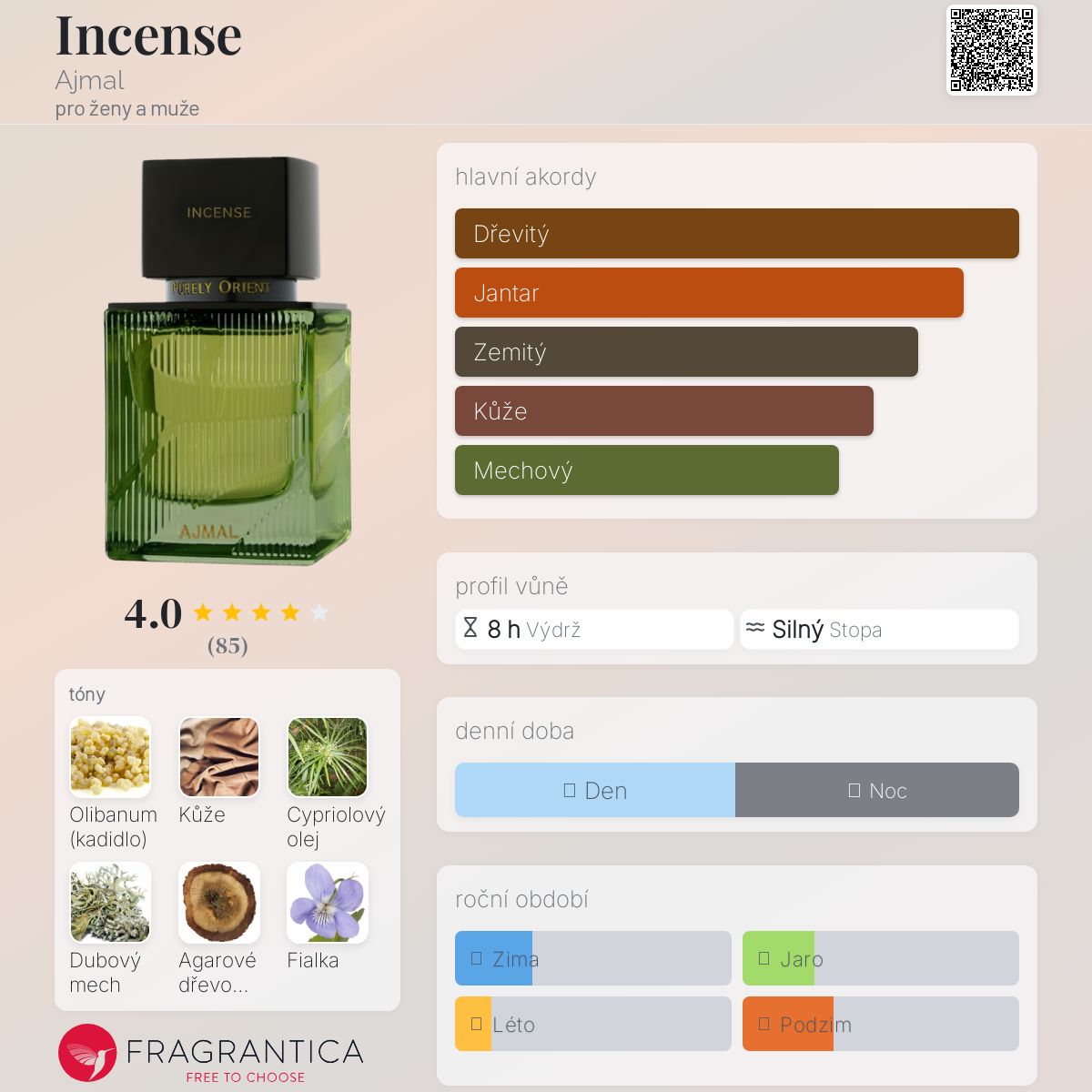 Incense podle Ajmal je Woody Spicy vůně pro ženy a muže. Incense byl/a uveden/a v roce 2019. Vrchní tóny jsou Kadidlo a Hořký pomeranč; střední tóny jsouCypriolový olej, Fialka, Guajakové dřevo a Růže ; základní tóny jsou Kůže, Mech, Agarové dřevo (oud) a Jantar (ambra).