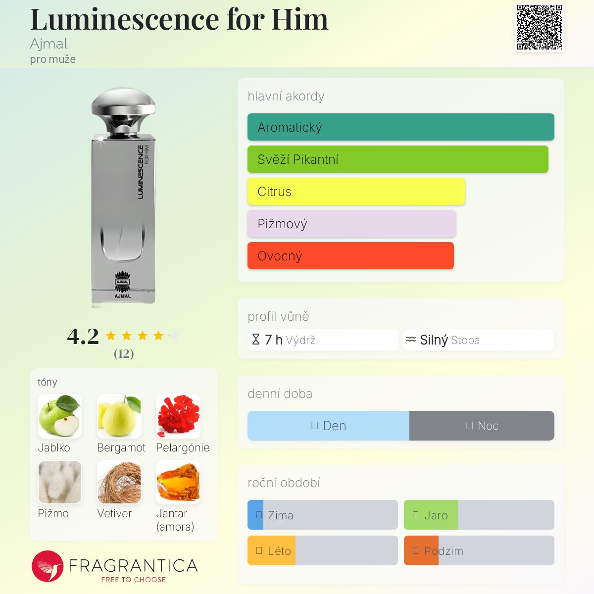 Luminescence for Him podle Ajmal je Woody Aromatic vůně pro muže. Luminescence for Him byl/a uveden/a v roce 2017. Vrchní tóny jsou Jablko a Bergamot; střední tóny jsouPelargónie a Levandule ; základní tóny jsou Pižmo, Vetiver a Jantar (ambra).