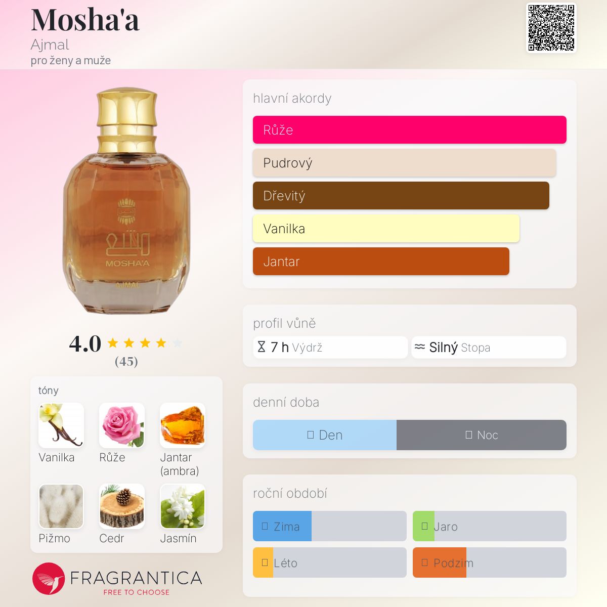 Mosha'a podle Ajmal je Orientální Spicy vůně pro ženy a muže. Mosha'a byl/a uveden/a v roce 2019. Vrchní tóny jsou Růže, Jasmín a Pelargónie; střední tóny jsouVanilka, Jantar (ambra) a Maliny ; základní tóny jsou Pižmo, Cedr, Santalové dřevo a Pačuli.