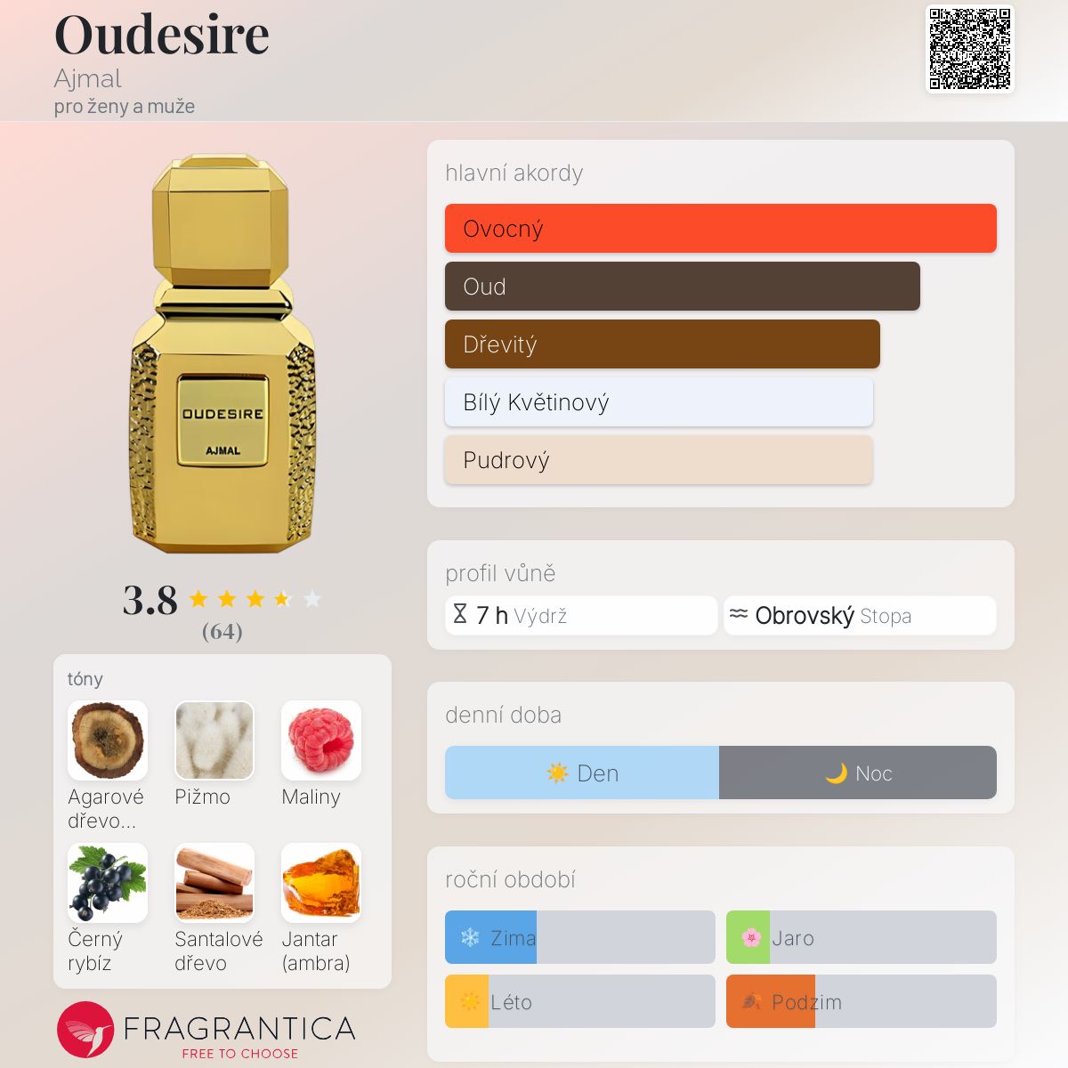 Oudesire podle Ajmal je Orientální Floral vůně pro ženy a muže. Oudesire byl/a uveden/a v roce 2016. Vrchní tóny jsou Jasmín, Pomerančový květ, Růže a Bergamot; střední tóny jsouMaliny, Černý rybíz a Zázvor ; základní tóny jsou Agarové dřevo (oud), Pižmo, Santalové dřevo a Jantar (ambra).