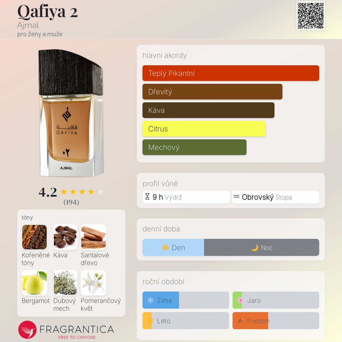 Qafiya 2 podle Ajmal je Orientální Floral vůně pro ženy a muže. Qafiya 2 byl/a uveden/a v roce 2016. Vrchní tóny jsou Káva a Bergamot; střední tóny jsouKoření a Pomerančový květ ; základní tóny jsou Santalové dřevo a Mech.