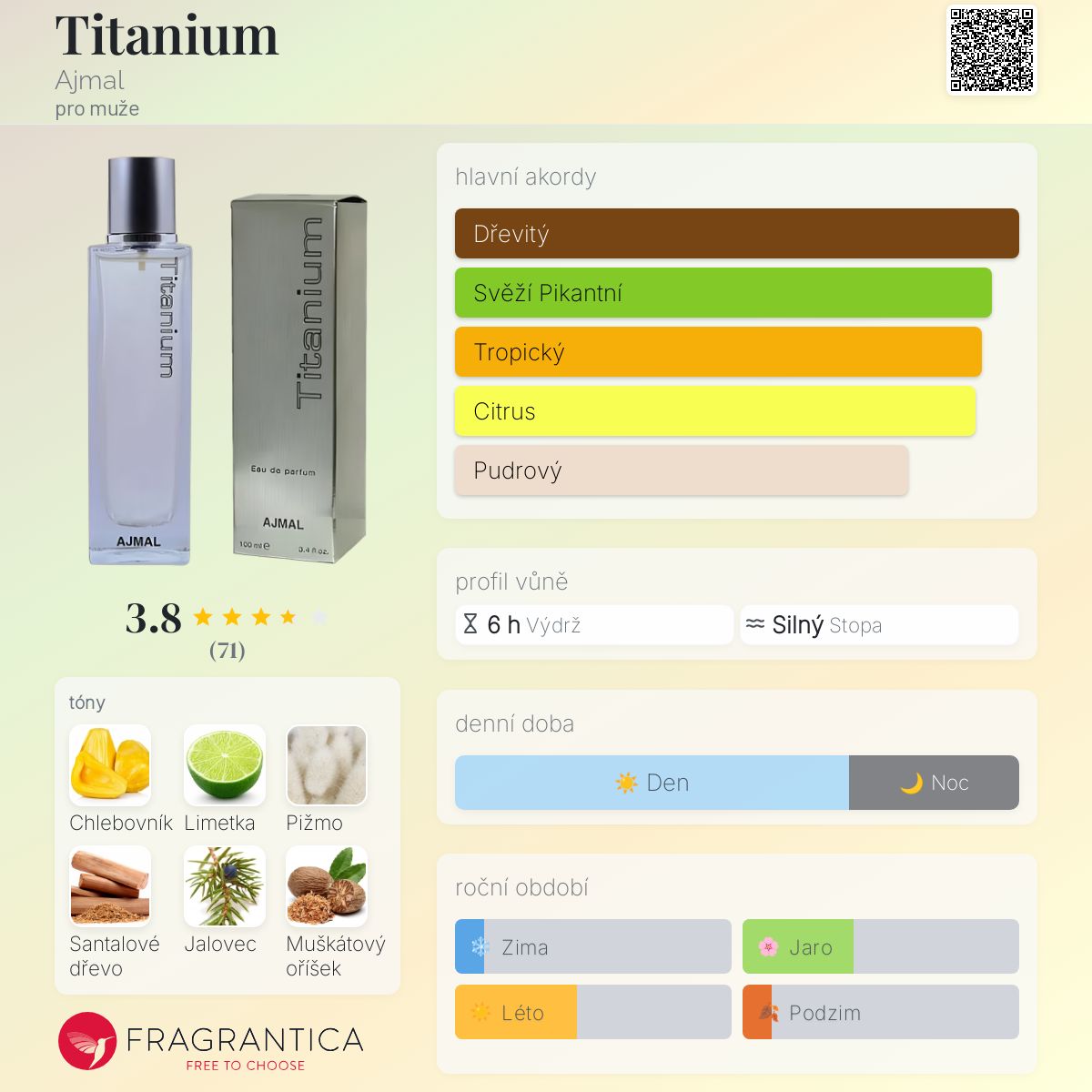 Titanium podle Ajmal je Aromatic Fruity vůně pro muže. Titanium byl/a uveden/a v roce 2010. Vrchní tóny jsou Limetka a Jalovec; střední tóny jsouChlebovník a Muškátový oříšek ; základní tóny jsou Pižmo a Santalové dřevo.