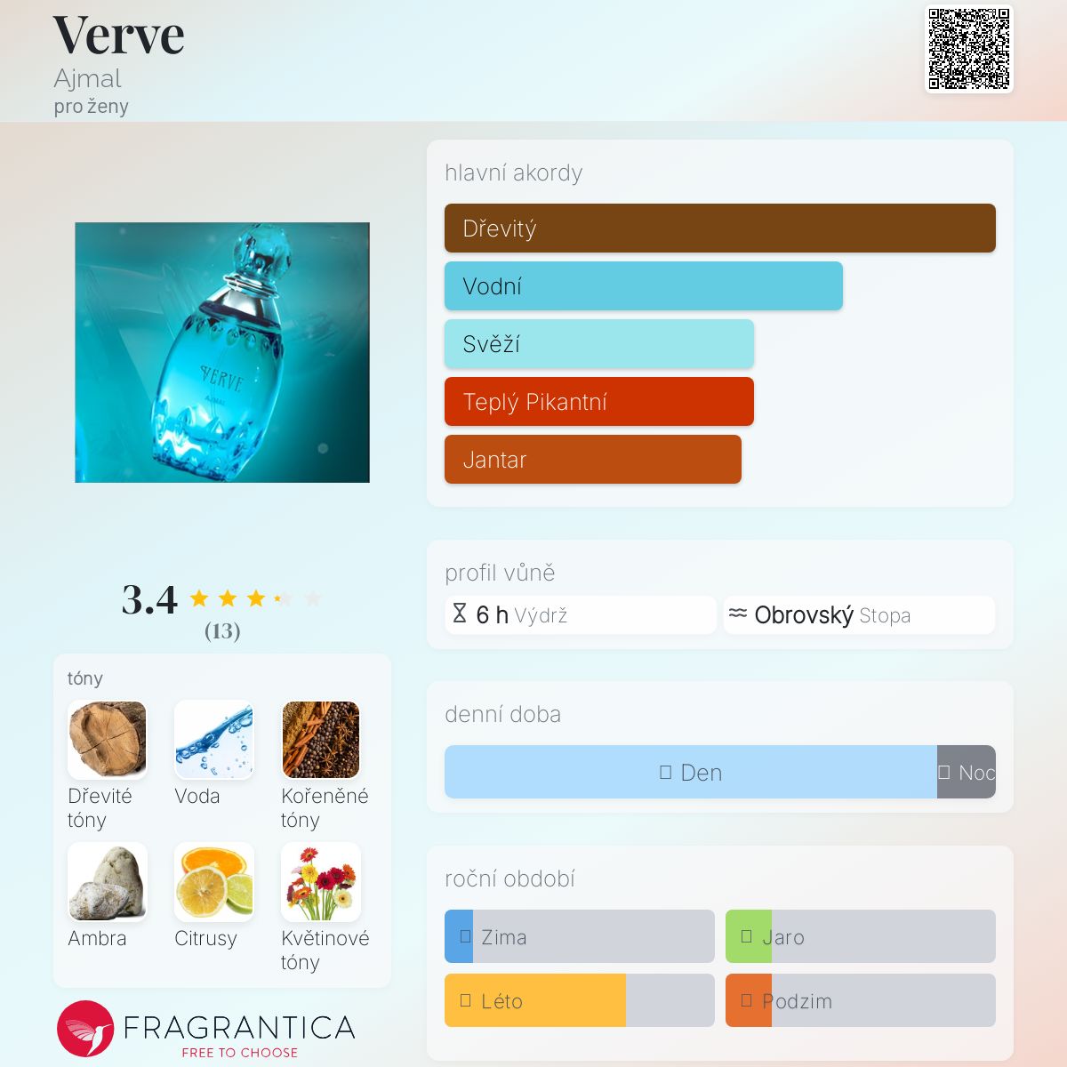 Verve podle Ajmal je Woody Spicy vůně pro ženy. Verve byl/a uveden/a v roce 2008. Vrchní tóny jsou Vodní tóny a Citrusy; střední tóny jsouKoření a Květinové tóny ; základní tóny jsou Dřevité tóny a Ambra.