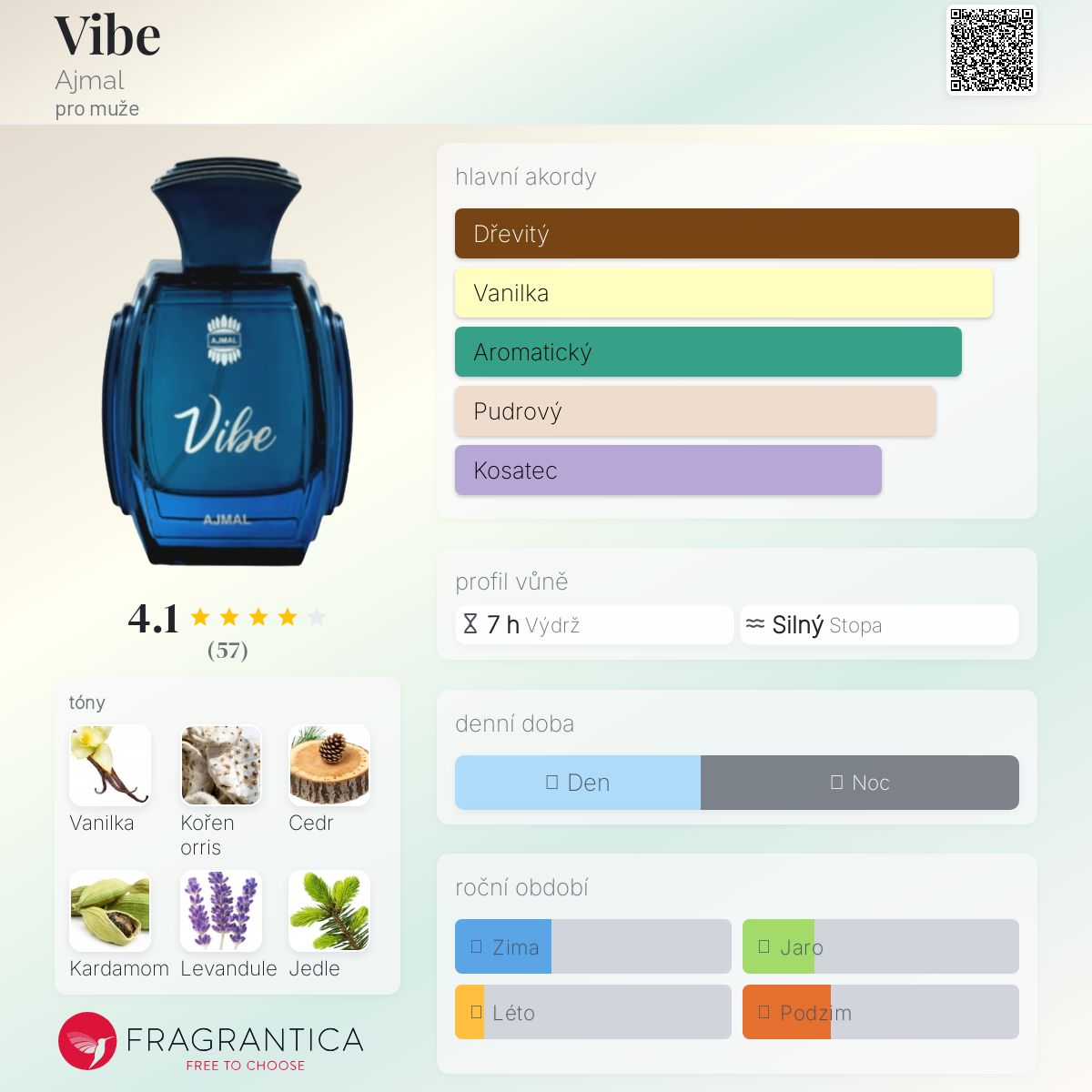 Vibe podle Ajmal je Woody Aromatic vůně pro muže. Vibe byl/a uveden/a v roce 2022. Vrchní tóny jsou Levandule a Pelyněk; střední tóny jsouKořen orris a Kardamom ; základní tóny jsou Vanilka, Cedr a Jedle balzámová.