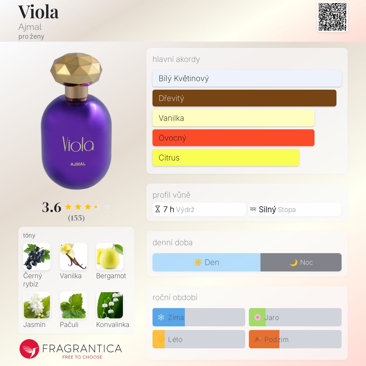 Viola podle Ajmal je Floral vůně pro ženy. Viola byl/a uveden/a v roce 2016. Vrchní tóny jsou Černý rybíz, Bergamot a Kořeněné tóny; střední tóny jsouJasmín, Konvalinka a Růže ; základní tóny jsou Vanilka, Pačuli a Cedr.