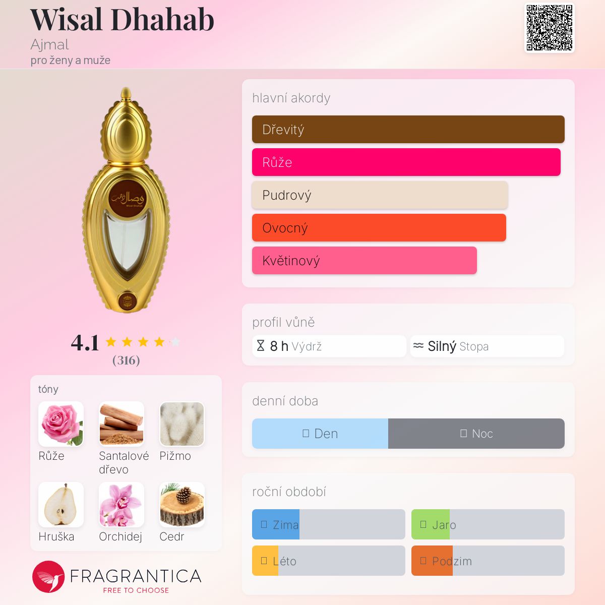 Wisal Dhahab podle Ajmal je Floral Woody Musk vůně pro ženy a muže. Wisal Dhahab byl/a uveden/a v roce 2015. Vrchní tóny jsou Hruška, Jablko, Broskev, Grapefruit a Mandarinka; střední tóny jsouRůže, Orchidej, Jasmín a Pelargónie ; základní tóny jsou Santalové dřevo, Pižmo, Cedr a Pačuli.