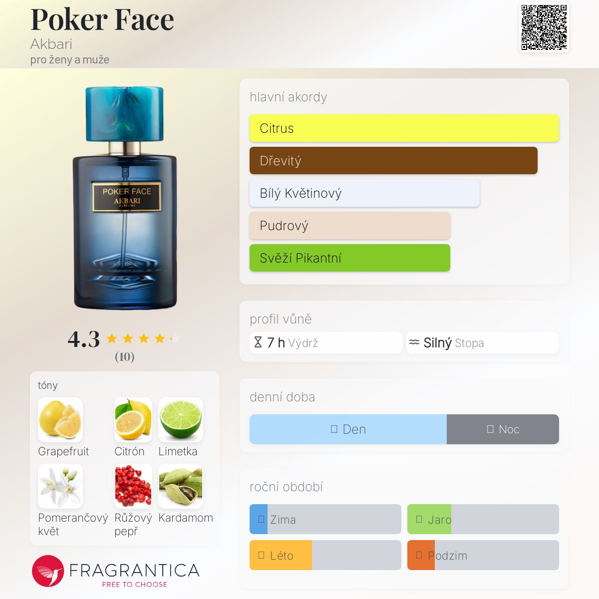 Poker Face podle Akbari je vůně pro ženy a muže. Vrchní tóny jsou Grapefruit, Citrón a Limetka; střední tóny jsouPomerančový květ, Růžový pepř, Kardamom, Jasmín, Muškátový oříšek a Vodnaté tóny ; základní tóny jsou Dřevité tóny, Santalové dřevo, Kůže, Cedr, Jantar (ambra) a Pižmo.