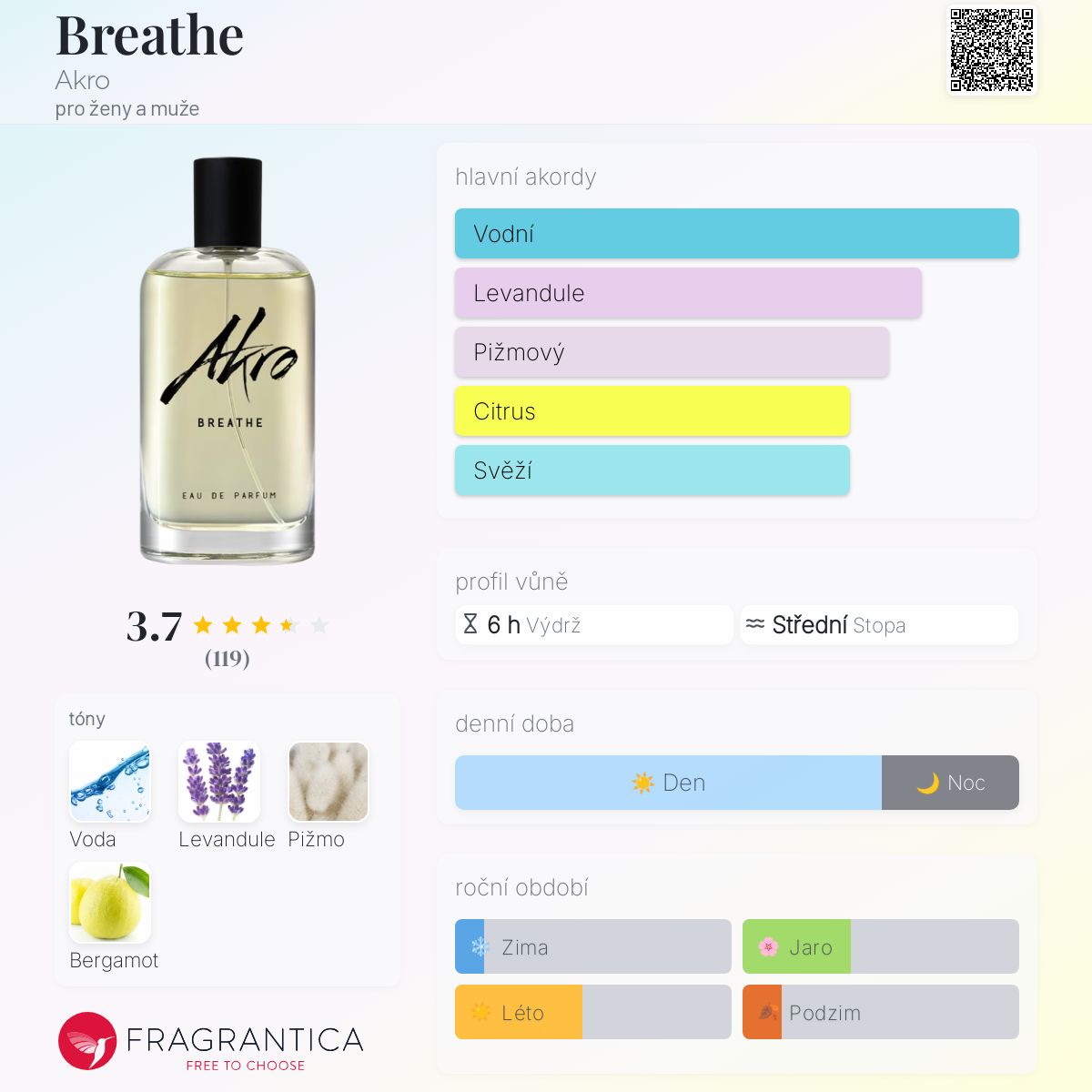 Breathe podle Akro je Aromatic Aquatic vůně pro ženy a muže. Toto je nová vůně. Breathe byl/a uveden/a v roce 2025. "Nosem" za touto vůní je Olivier Cresp. Vrchní tóny jsou Levandule a Bergamot; střední tón jeVodní tóny ; základní tón je Pižmo.