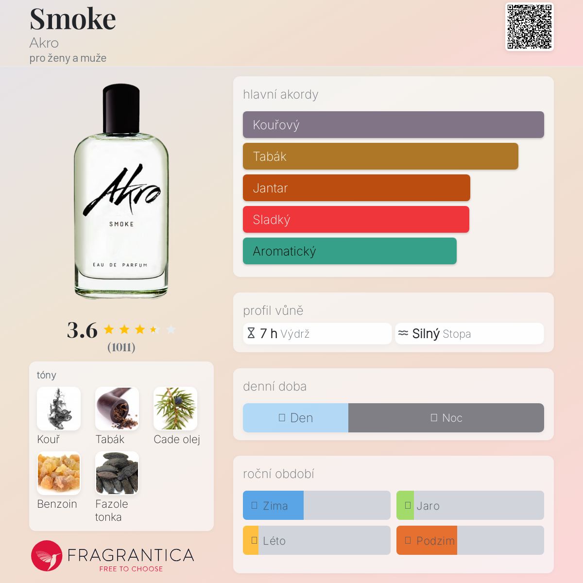 Smoke podle Akro je Orientální Woody vůně pro ženy a muže. Smoke byl/a uveden/a v roce 2018. "Nosem" za touto vůní je Olivier Cresp.