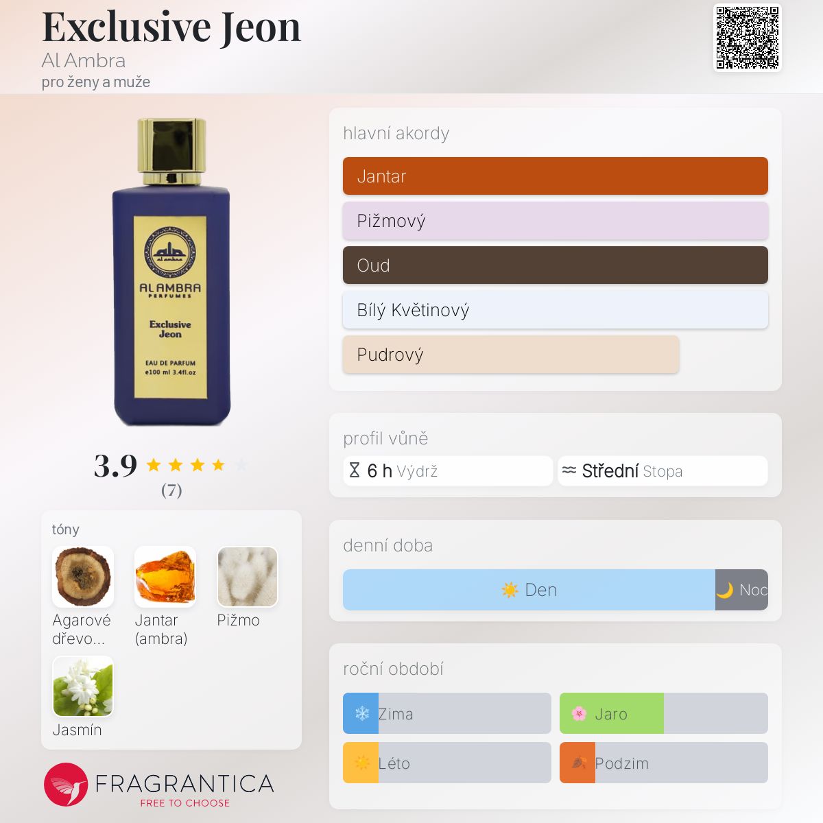 Exclusive Jeon podle Al Ambra je vůně pro ženy a muže. Exclusive Jeon byl/a uveden/a v roce 2020. Exclusive Jeon byl/a vytvořen/a Ghanim Yaqoob Jumma Khurram a Abdul Rahiman Mugarithottam. Vrchní tón je Agarové dřevo (oud) ; střední tóny jsouPižmo a Jantar (ambra) ; základní tón je Jasmín.