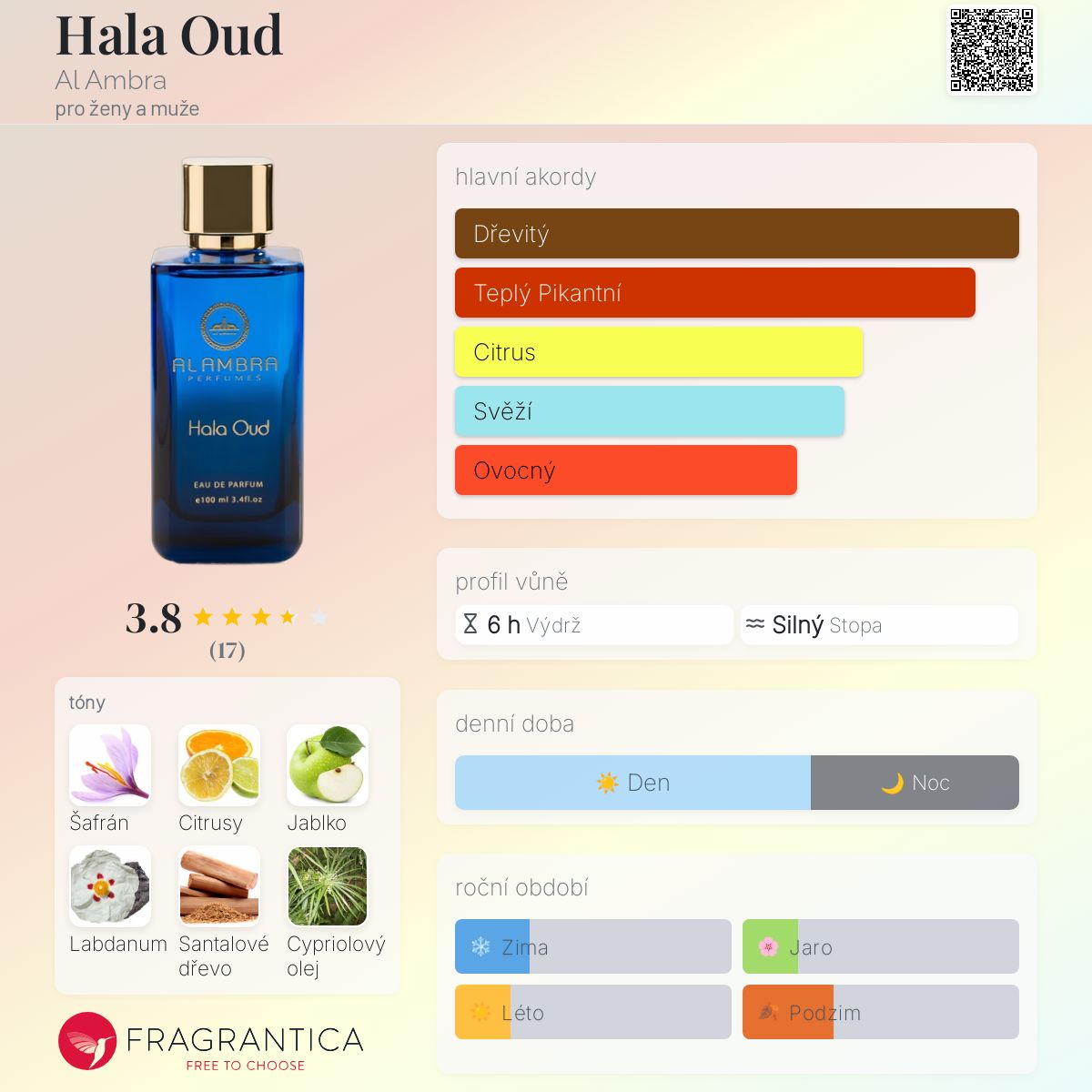 Hala Oud podle Al Ambra je Orientální Spicy vůně pro ženy a muže. Hala Oud byl/a uveden/a v roce 2014. "Nosem" za touto vůní je Abdul Rahiman Mugarithottam. Vrchní tóny jsou Citrusy a Jablko; střední tóny jsouŠafrán, Labdanum, Hřebíček a Skořice ; základní tóny jsou Santalové dřevo, Cypriolový olej a Dřevité tóny.