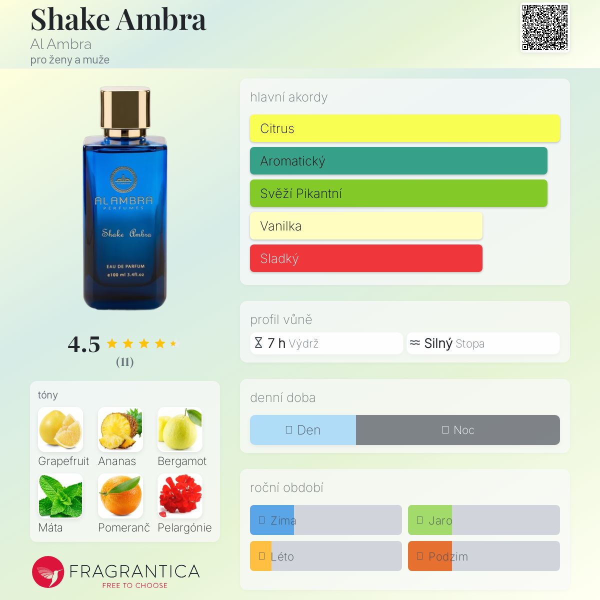 Shake Ambra podle Al Ambra je Orientální vůně pro ženy a muže. Shake Ambra byl/a uveden/a v roce 2014. "Nosem" za touto vůní je Abdul Rahiman Mugarithottam. Vrchní tóny jsou Grapefruit, Ananas, Bergamot, Máta a Pomeranč; střední tóny jsouPelargónie, Levandule a Skořice ; základní tóny jsou Santalové dřevo, Jantar (ambra), Fazole tonka a Vanilka.