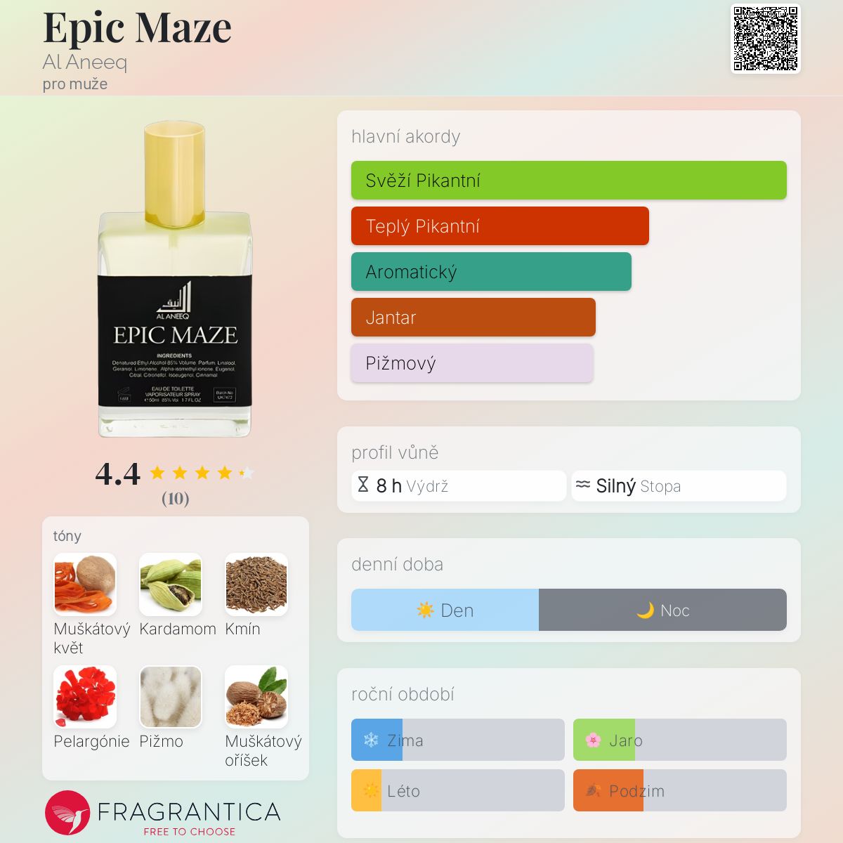 Epic Maze podle Al Aneeq je Orientální Spicy vůně pro muže. Epic Maze byl/a uveden/a v roce 2017. Vrchní tóny jsou Muškátový květ, Kardamom, Kmín, Muškátový oříšek, Růžový pepř, Myrta a Šafrán; střední tóny jsouPelargónie, Olibanum a Myrha ; základní tóny jsou Pižmo, Agarové dřevo (oud), Cedr, Kůže, Pačuli a Santalové dřevo.