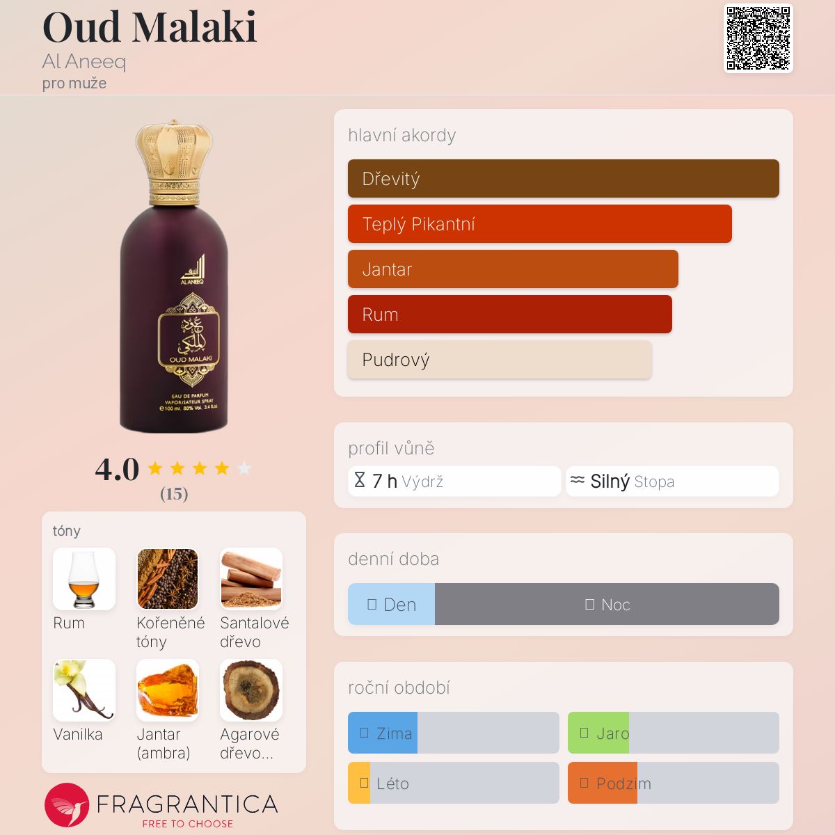 Oud Malaki podle Al Aneeq je Orientální vůně pro muže. Oud Malaki byl/a uveden/a v roce 2019. Vrchní tóny jsou Rum, Kořeněné tóny, Labdanum a Jasmín; střední tóny jsouSantalové dřevo, Vanilka, Jantar (ambra) a Cypriolový olej ; základní tóny jsou Agarové dřevo (oud), Tabák a Zvířecí tóny.