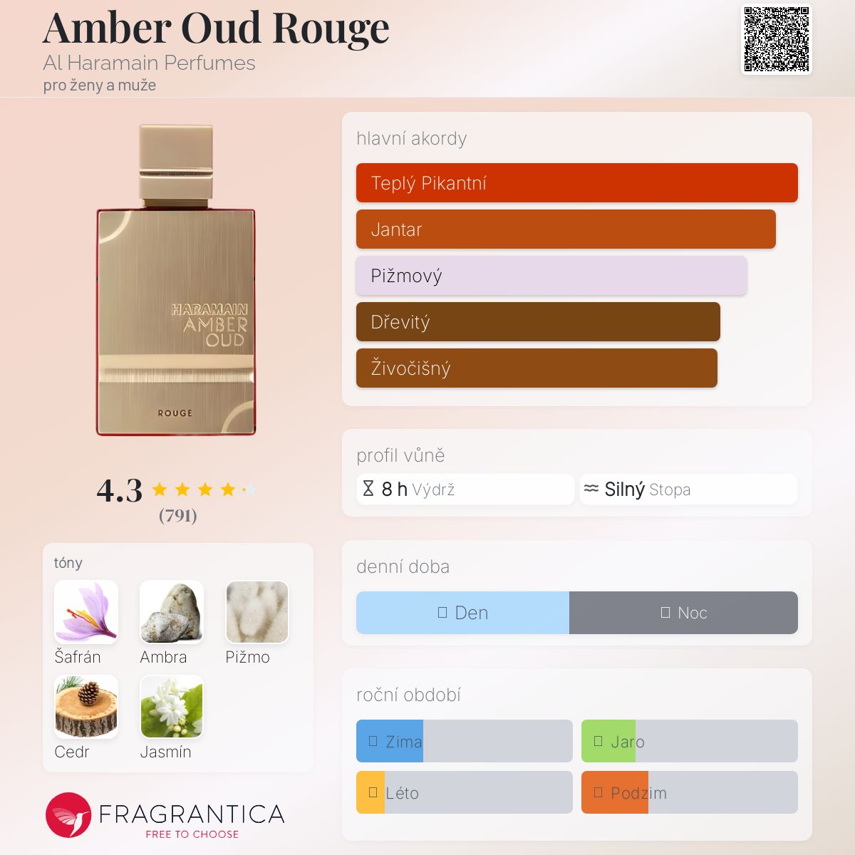 Amber Oud Rouge podle Al Haramain Perfumes je Orientální Floral vůně pro ženy a muže. Amber Oud Rouge byl/a uveden/a v roce 2019. Vrchní tón je Šafrán ; střední tón jeJasmín ; základní tóny jsou Ambra, Pižmo a Extrakt z bílého cedru.