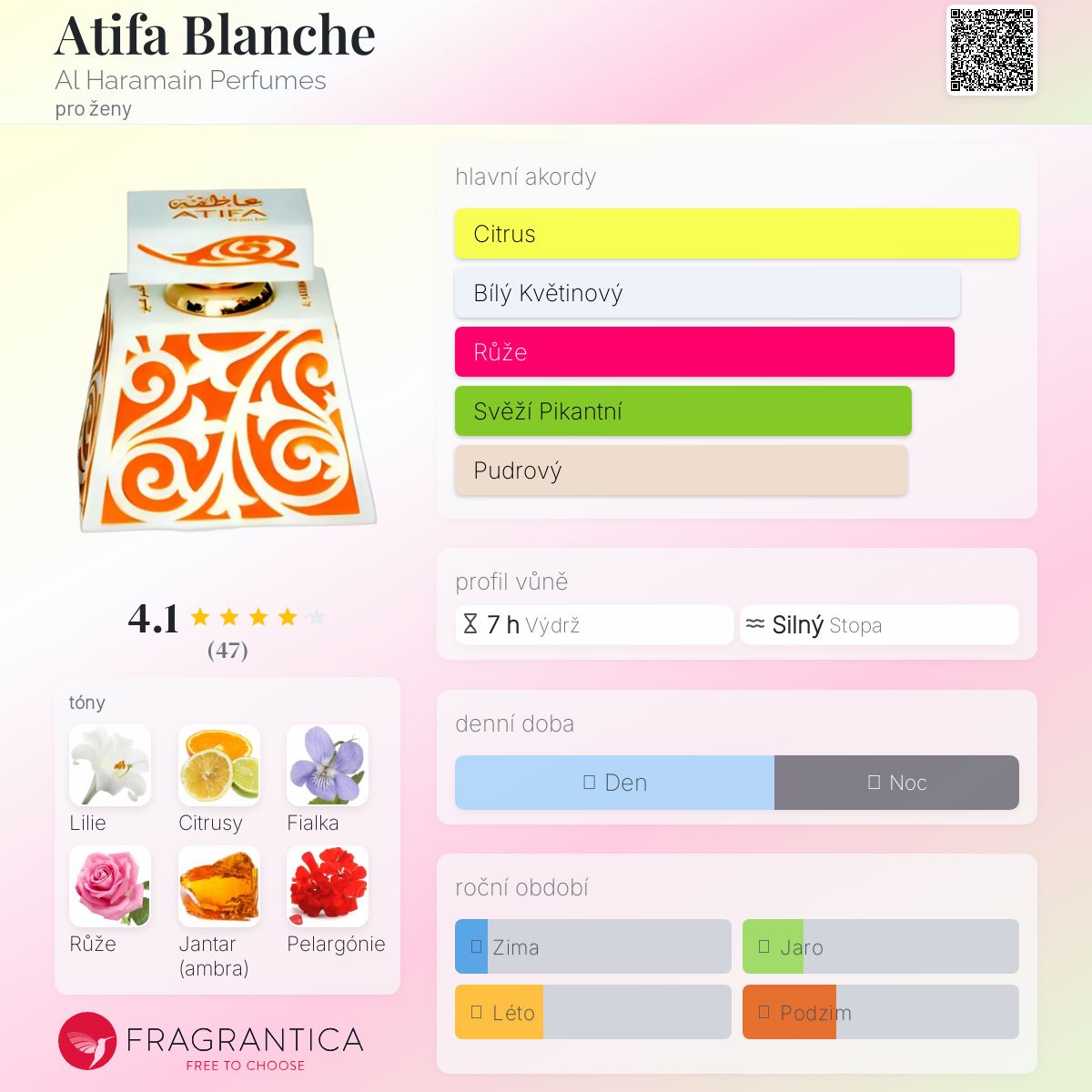 Atifa Blanche podle Al Haramain Perfumes je vůně pro ženy. "Nosem" za touto vůní je Christian Carbonnel. Vrchní tóny jsou Citrusy, Mořské tóny a Limetka; střední tóny jsouFialka, Růže, Pelargónie, Vanilka a Kořeněné tóny ; základní tóny jsou Lilie, Jantar (ambra) a Cedr.