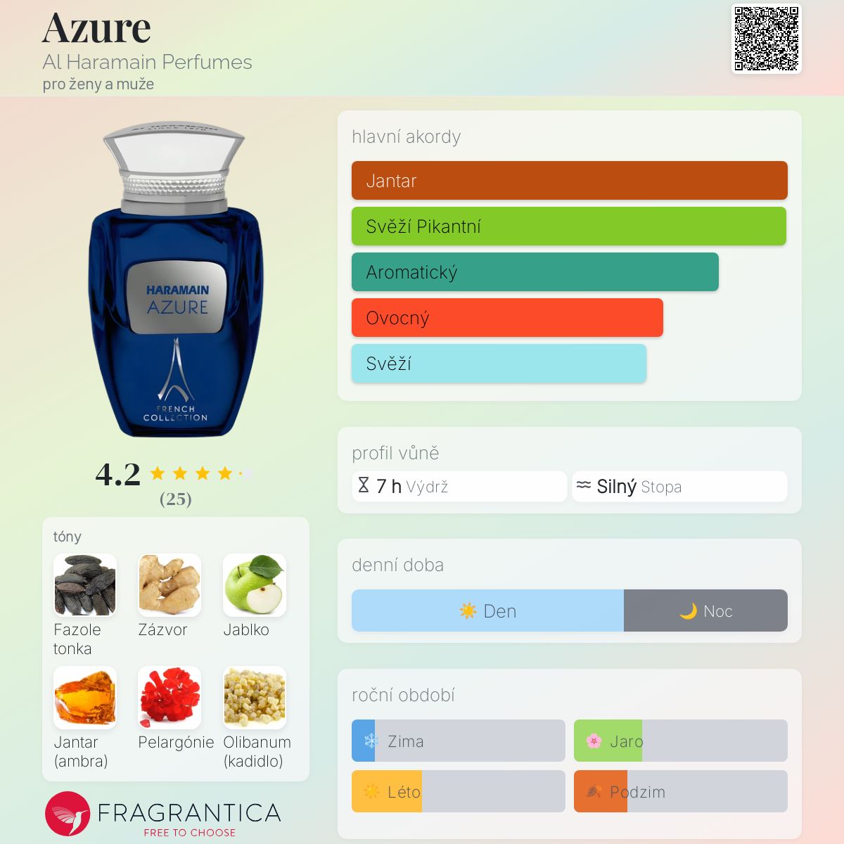Azure podle Al Haramain Perfumes je vůně pro ženy a muže. Azure byl/a uveden/a v roce 2023. Vrchní tóny jsou Zázvor, Jablko a Grapefruit; střední tóny jsouPelargónie, Šalvěj a Borůvky ; základní tóny jsou Fazole tonka, Jantar (ambra), Olibanum a Cedr.