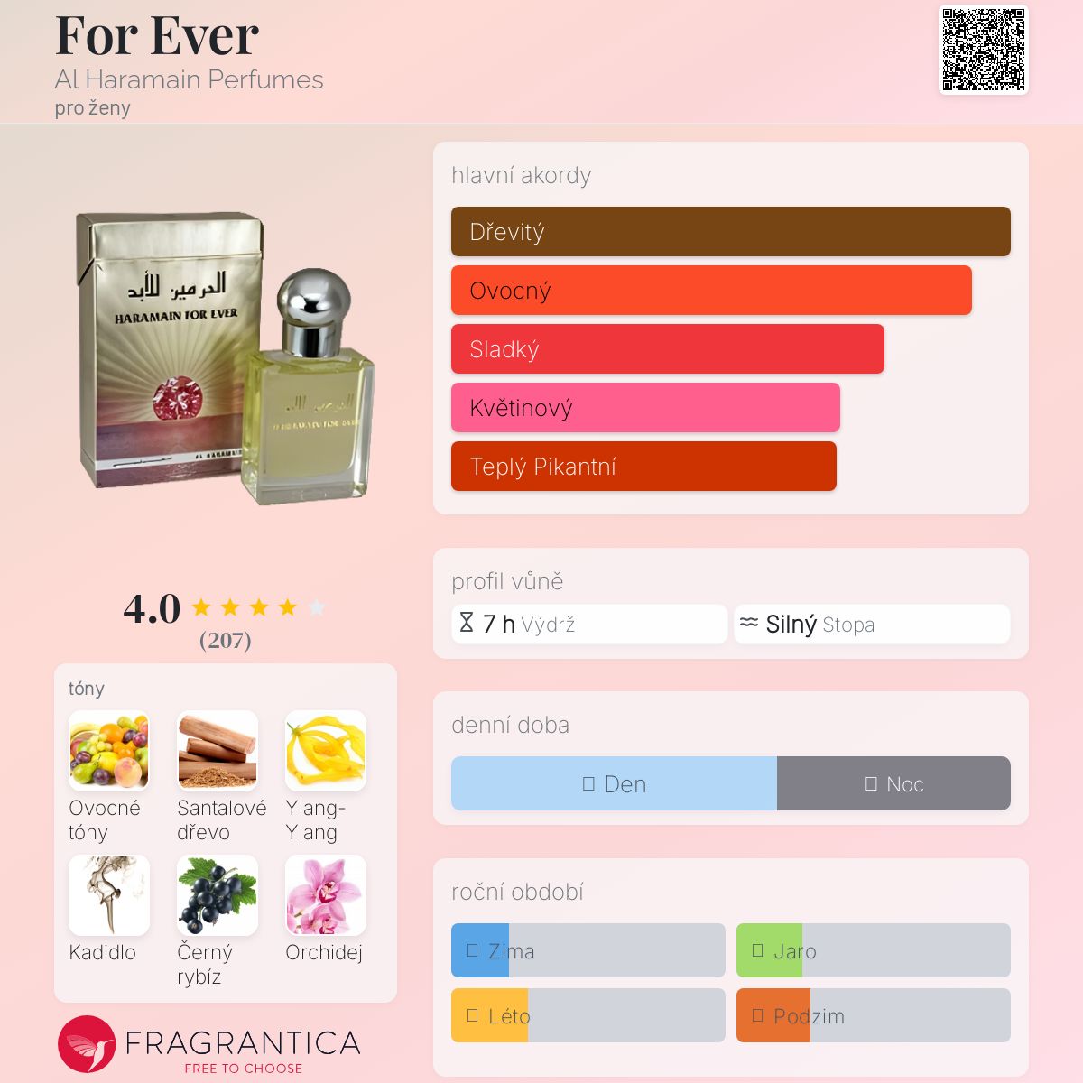 For Ever podle Al Haramain Perfumes je Floral Fruity Gourmand vůně pro ženy. Vrchní tóny jsou Ylang-Ylang, Sirup z černého rybízu a Bergamot; střední tóny jsouOvocné tóny, Orchidej a Lotus ; základní tóny jsou Santalové dřevo, Kadidlo a Pačuli.