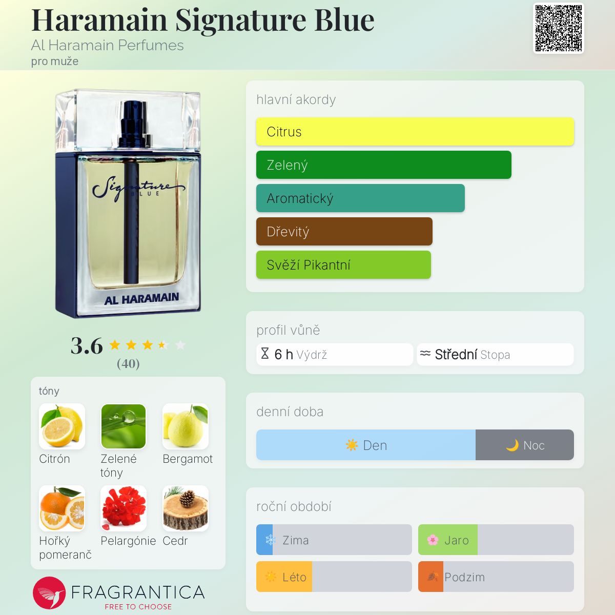 Haramain Signature Blue podle Al Haramain Perfumes je Orientální Fougere vůně pro muže. Haramain Signature Blue byl/a uveden/a v roce 2020. Vrchní tóny jsou Citrón, Zelené listí, Bergamot, Hořký pomeranč a Grapefruit; střední tón jePelargónie ; základní tóny jsou Cedr, Vetiver a Pačuli.