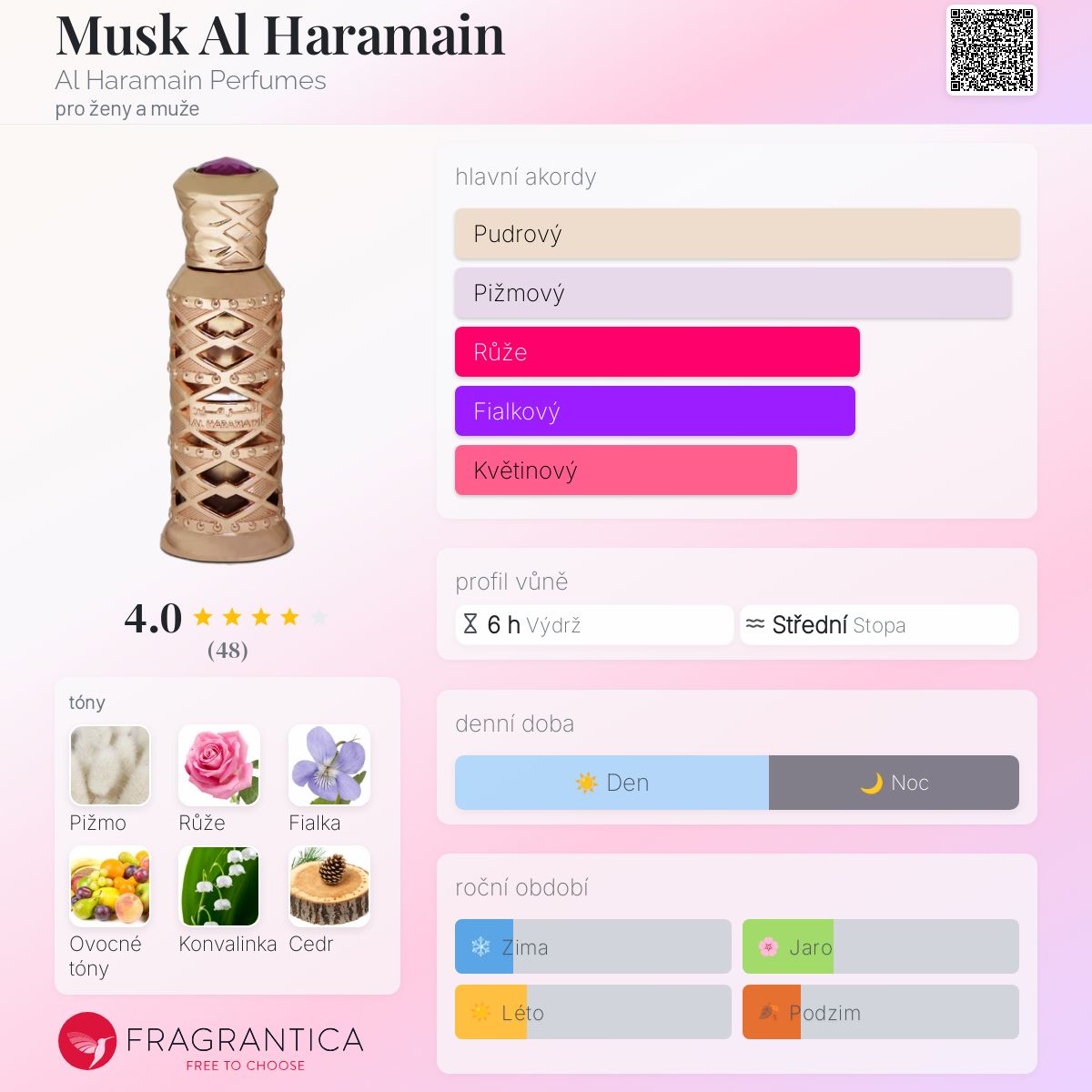 Musk Al Haramain podle Al Haramain Perfumes je Floral Woody Musk vůně pro ženy a muže. Musk Al Haramain byl/a uveden/a v roce 2021. Vrchní tón je Ovocné tóny ; střední tóny jsouRůže, Fialka a Konvalinka ; základní tóny jsou Pižmo, Cedr, Vanilka a Jantar (ambra).