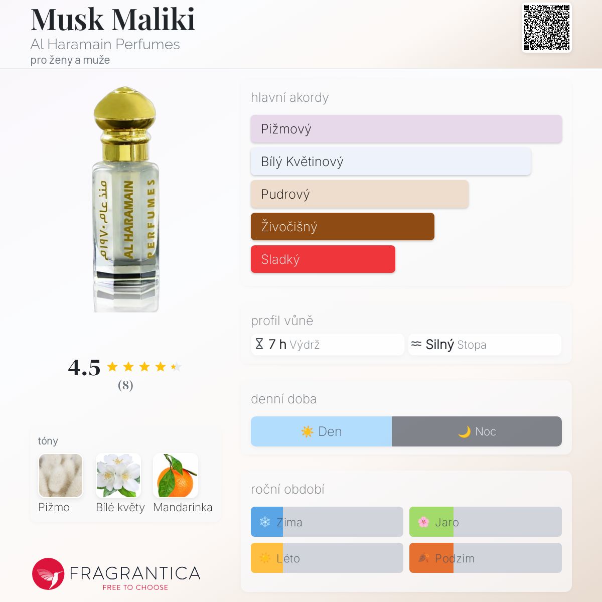 Musk Maliki podle Al Haramain Perfumes je Floral Woody Musk vůně pro ženy a muže. Vrchní tóny jsou Bílé pižmo, Bílé květy a Mandarinka; střední tóny jsouBílé pižmo a Bílé květy ; základní tóny jsou Bílé pižmo a Bílé květy.
