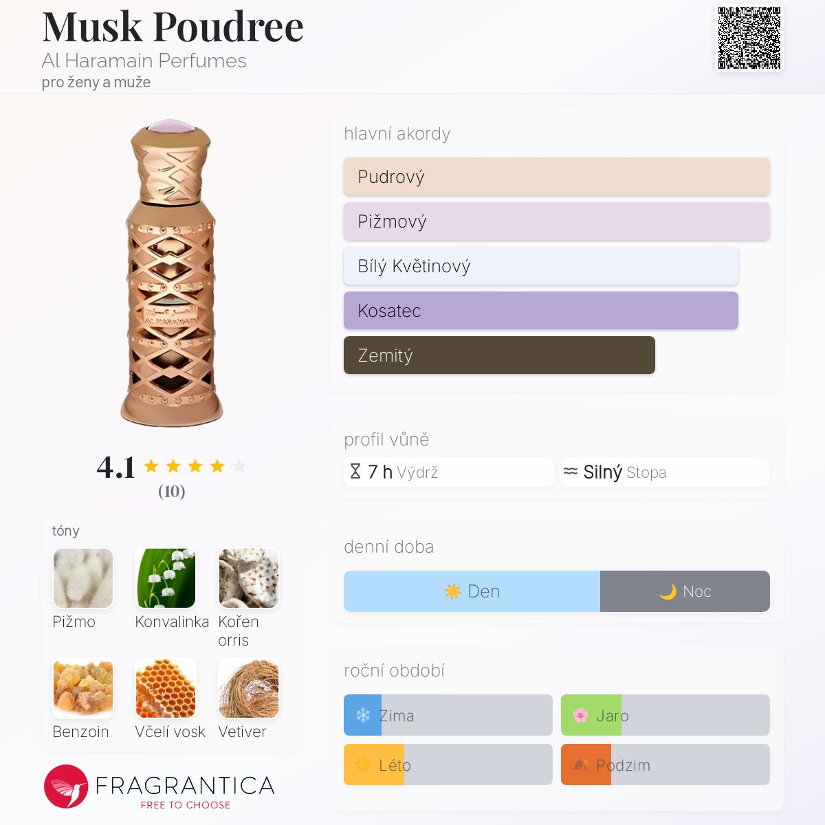 Musk Poudree podle Al Haramain Perfumes je Woody Aromatic vůně pro ženy a muže. Musk Poudree byl/a uveden/a v roce 2023. Vrchní tóny jsou Konvalinka, Kořen orris a Benzoin; střední tóny jsouPižmo, Včelí vosk a Ylang-Ylang ; základní tóny jsou Vetiver, Pačuli, Kumarin a Cedr.