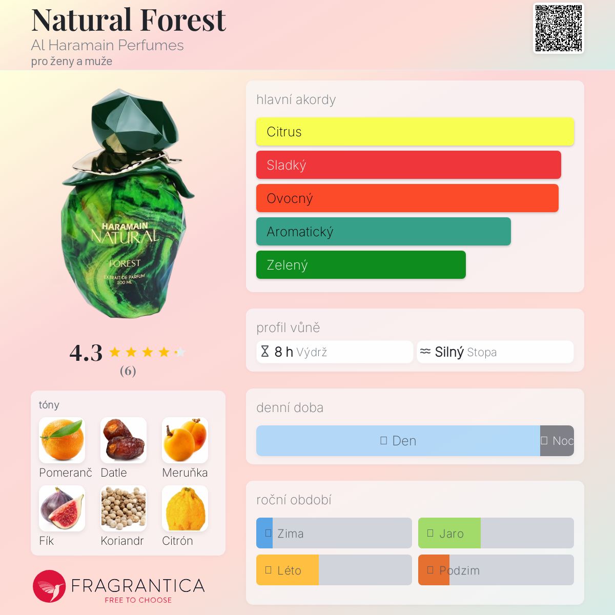 Natural Forest podle Al Haramain Perfumes je Aromatic Fruity vůně pro ženy a muže. Toto je nová vůně. Natural Forest byl/a uveden/a v roce 2025. Vrchní tóny jsou Pomeranč, Koriandr a Citrón, Máta, Černý rybíz a Citrón; střední tóny jsouMeruňka, Květná růže, Bazalka a Semena mrkve ; základní tóny jsou Datle, Fík a Ambrette (přírodní pižmo).