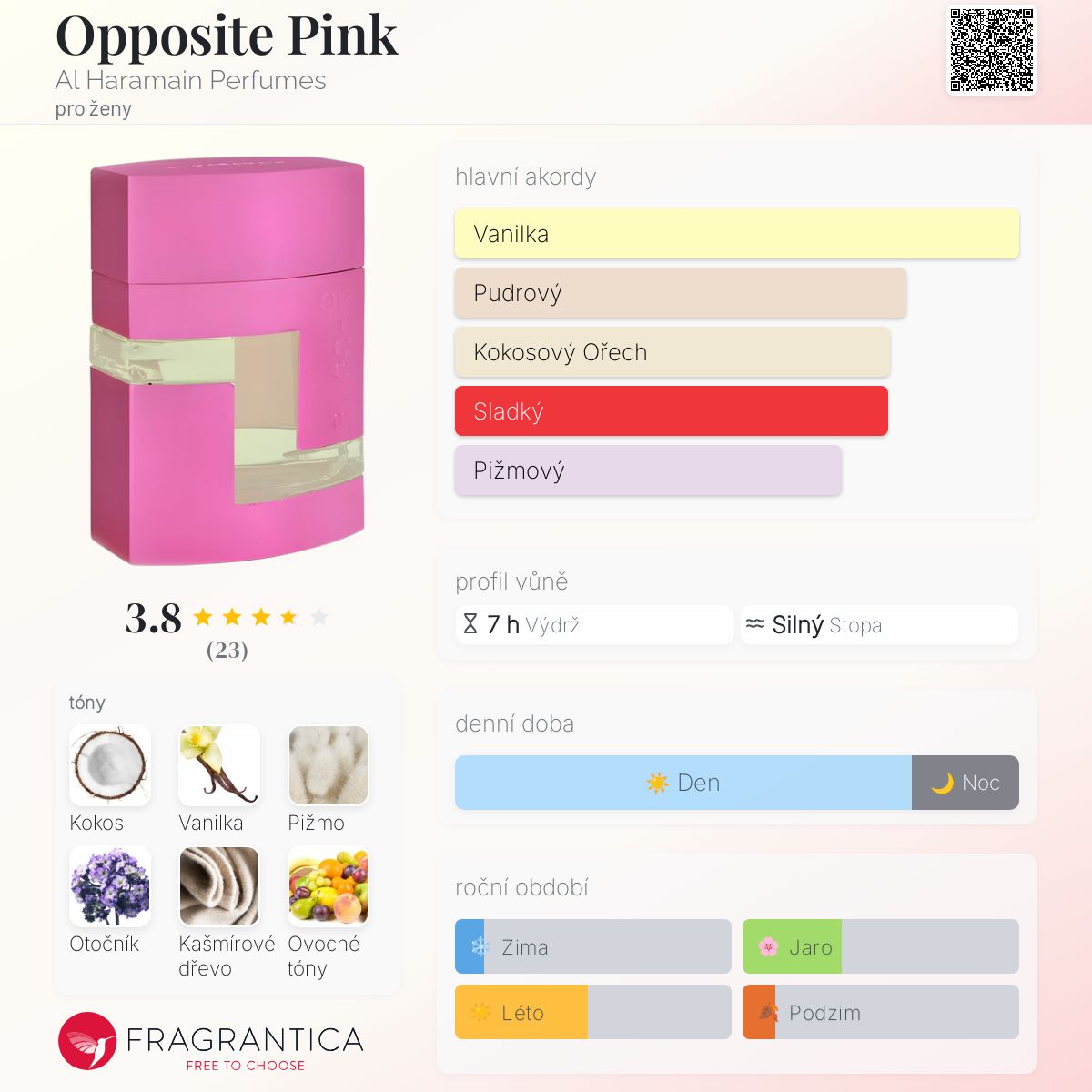 Opposite Pink podle Al Haramain Perfumes je Floral Fruity Gourmand vůně pro ženy. Vrchní tóny jsou Ovocné tóny a Pomeranč; střední tóny jsouOtočník, Kašmírové dřevo, Santalové dřevo, Tuberóza a Jasmín ; základní tóny jsou Kokos, Vanilka, Pižmo, Fazole tonka, Jantar (ambra), Mech a Cedr.