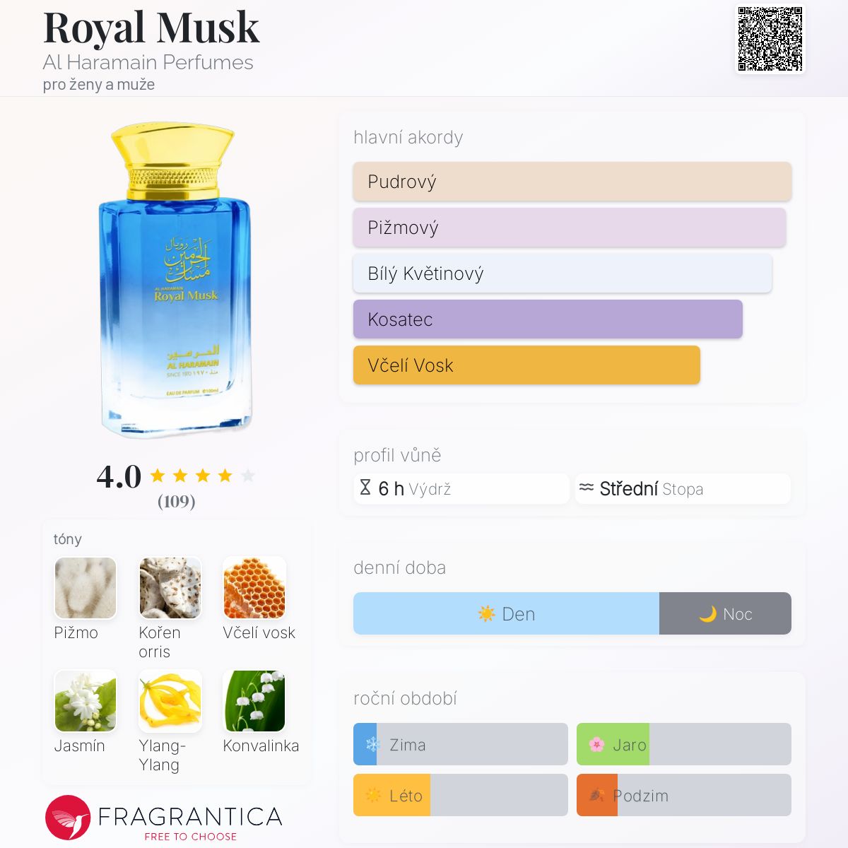 Royal Musk podle Al Haramain Perfumes je vůně pro ženy a muže. Royal Musk byl/a uveden/a v roce 2021. Vrchní tóny jsou Ylang-Ylang, Bergamot a Pepř; střední tóny jsouOrris, Jasmín a Konvalinka ; základní tóny jsou Pižmo a Včelí vosk.