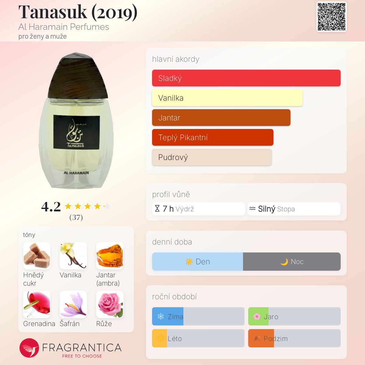 Tanasuk (2019) podle Al Haramain Perfumes je Orientální Floral vůně pro ženy a muže. Tanasuk (2019) byl/a uveden/a v roce 2019. Vrchní tóny jsou Grenadina, Šafrán a Růže; střední tóny jsouJantar (ambra), Dřevité tóny a Jasmín ; základní tóny jsou Hnědý cukr, Vanilka a Pižmo.