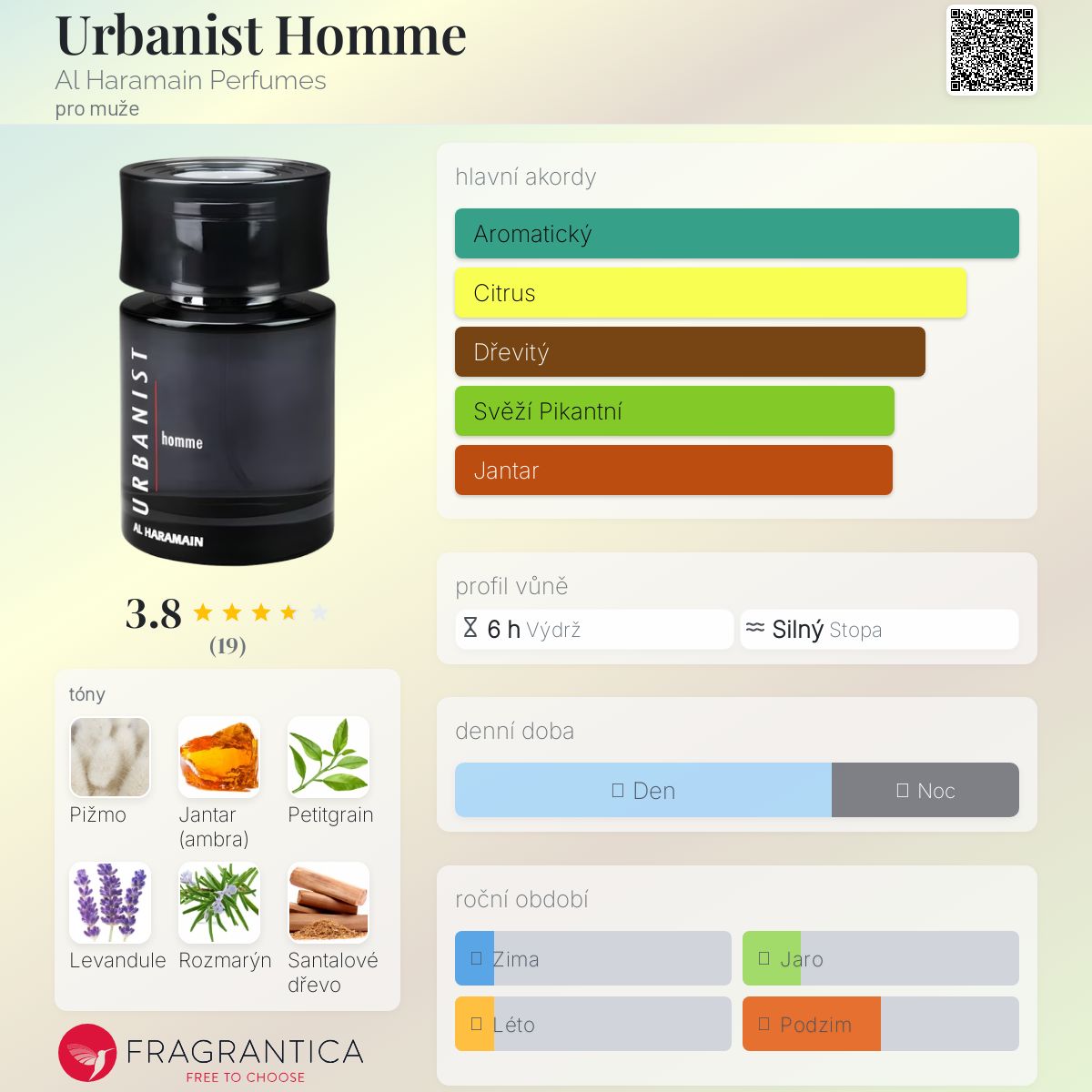Urbanist Homme podle Al Haramain Perfumes je Orientální Spicy vůně pro muže. "Nosem" za touto vůní je Christian Carbonnel. Vrchní tóny jsou Petitgrain, Pomeranč a Citrón; střední tóny jsouLevandule, Rozmarýn a Jasmín ; základní tóny jsou Pižmo, Jantar (ambra), Santalové dřevo a Fazole tonka.