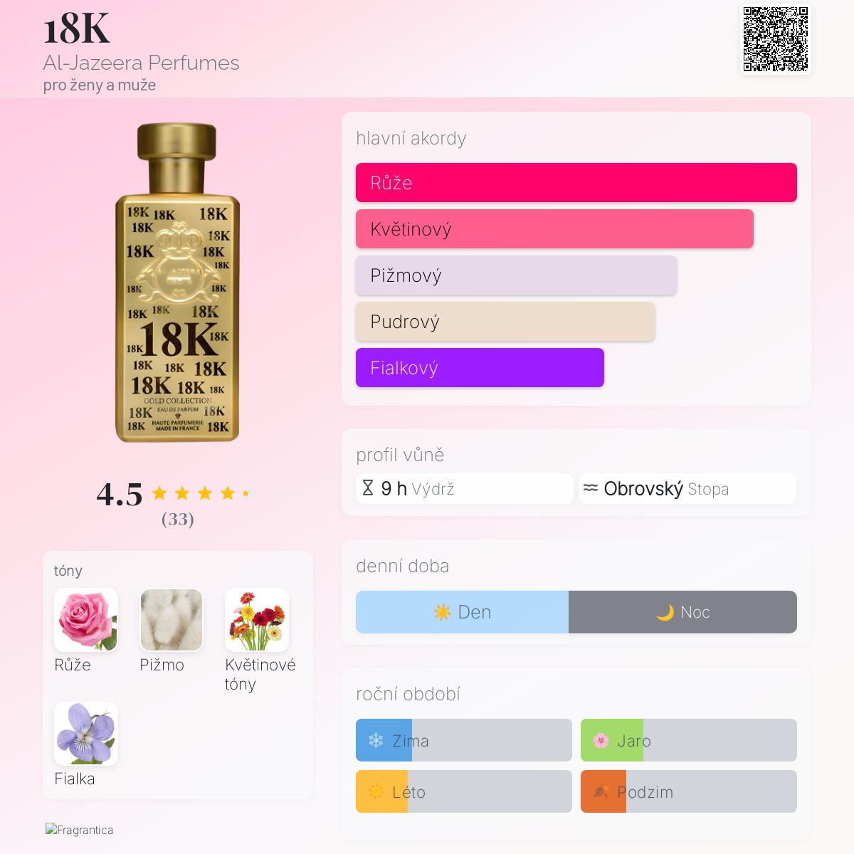 18K podle Al-Jazeera Perfumes je Floral vůně pro ženy a muže. 18K byl/a uveden/a v roce 2014.