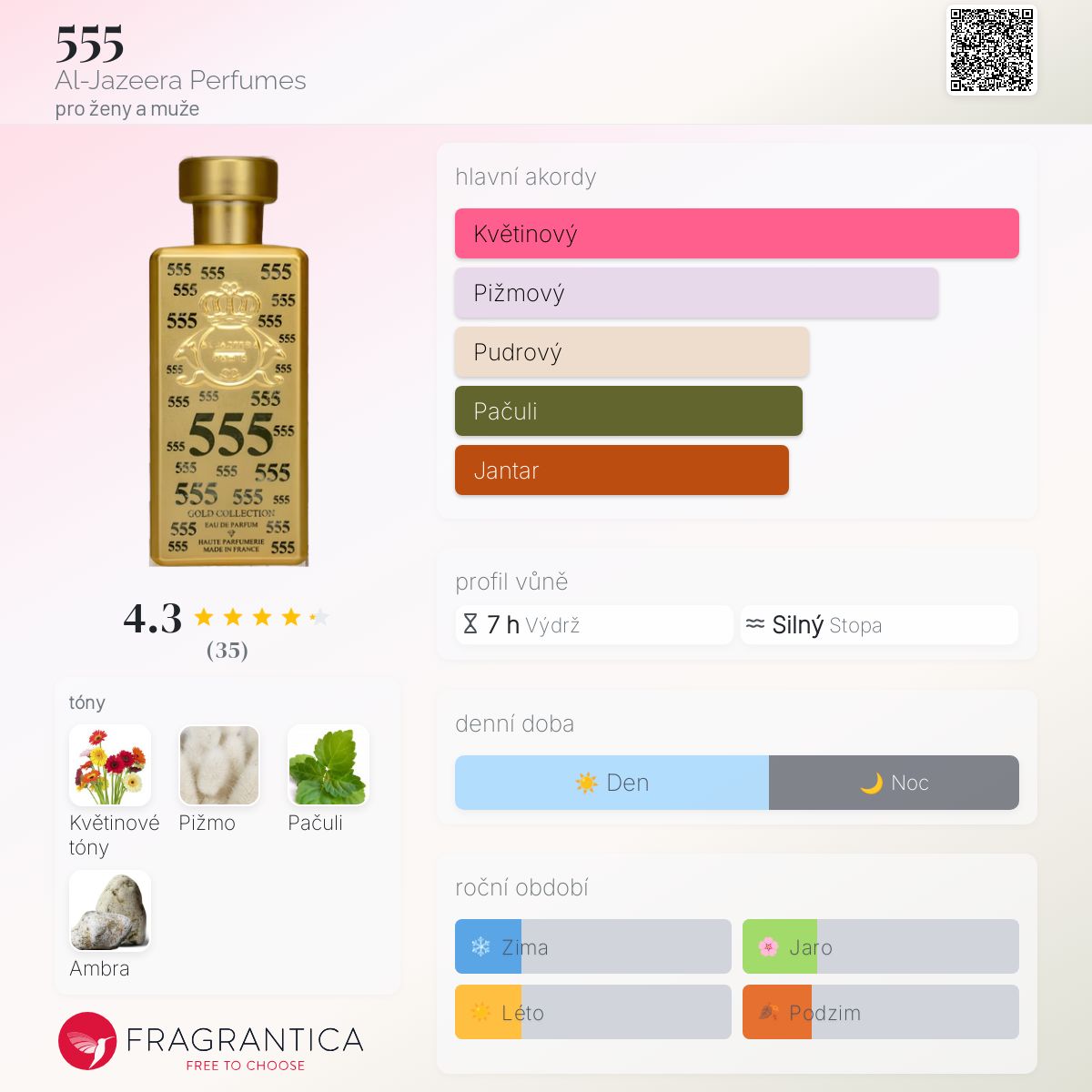 555 podle Al-Jazeera Perfumes je Woody Floral Musk vůně pro ženy a muže. 555 byl/a uveden/a v roce 2013.