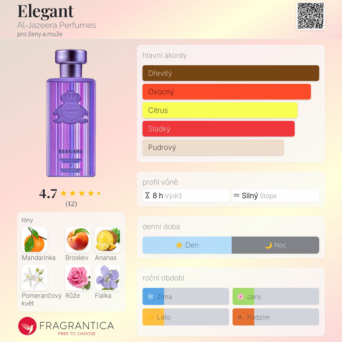 Elegant podle Al-Jazeera Perfumes je Floral Fruity vůně pro ženy a muže. Elegant byl/a uveden/a v roce 2015. "Nosem" za touto vůní je Dominique Ropion. Vrchní tóny jsou Mandarinka, Broskev a Ananas; střední tóny jsouPomerančový květ, Růže a Fialka ; základní tóny jsou Pačuli, Amber Xtreme, Kašmír a Cypriolový olej.