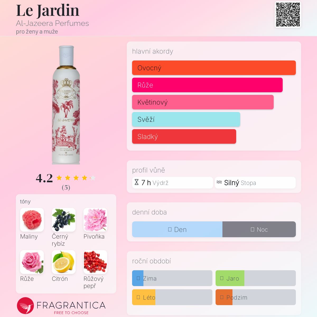 Le Jardin podle Al-Jazeera Perfumes je Chypre Fruity vůně pro ženy a muže. Le Jardin byl/a uveden/a v roce 2021. "Nosem" za touto vůní je Fanny Bal. Vrchní tóny jsou Maliny, Černý rybíz a Citrón; střední tóny jsouPivoňka, Turecký růžový olej a Růžový pepř ; základní tóny jsou Pačuli, Kašmír a Sinfonide.