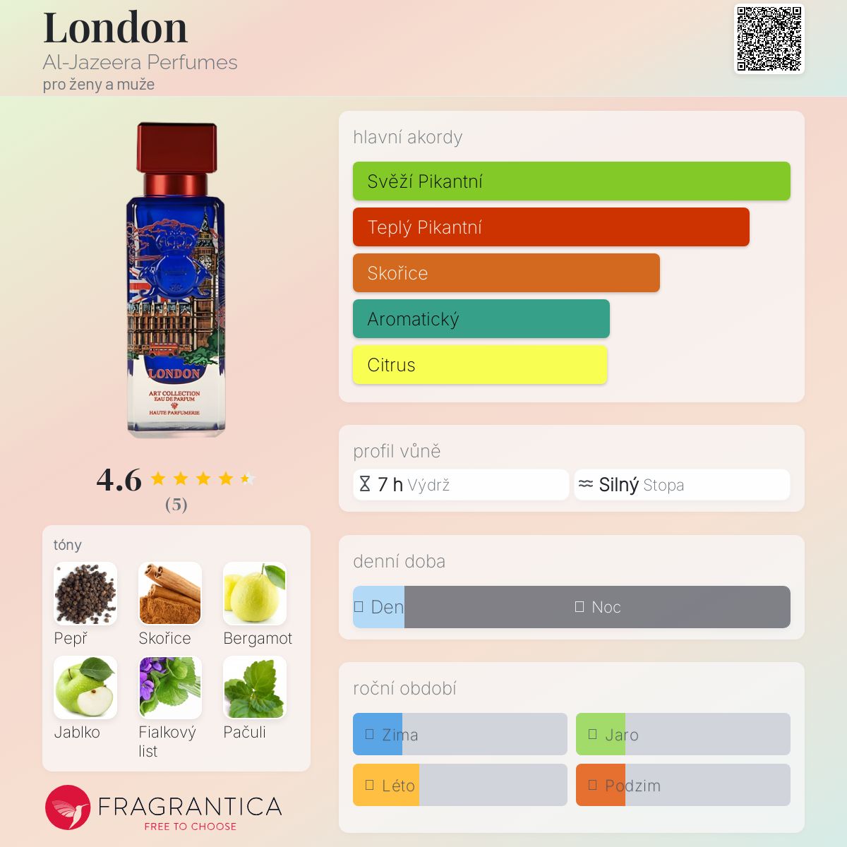 London podle Al-Jazeera Perfumes je Orientální Floral vůně pro ženy a muže. London byl/a uveden/a v roce 2020. "Nosem" za touto vůní je Fanny Bal. Vrchní tóny jsou Černý pepř, Bergamot a Jablko; střední tóny jsouSkořice, Fialkový list a Pelargónie ; základní tóny jsou Pačuli, Kašmír a Vanilka.