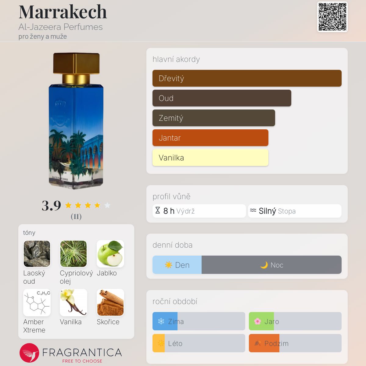 Marrakech podle Al-Jazeera Perfumes je Orientální Woody vůně pro ženy a muže. Marrakech byl/a uveden/a v roce 2022. "Nosem" za touto vůní je Julien Rasquinet. Vrchní tóny jsou Jablko, Skořice a Muškátový oříšek; střední tóny jsouLaoský oud, Cypriolový olej a Virginský cedr ; základní tóny jsou Amber Xtreme, Vanilka a Pačuli.